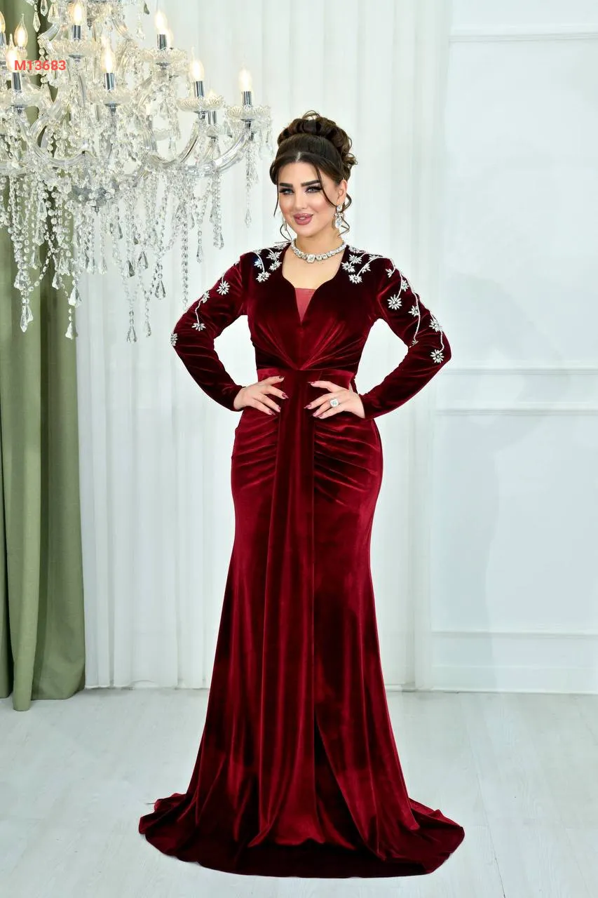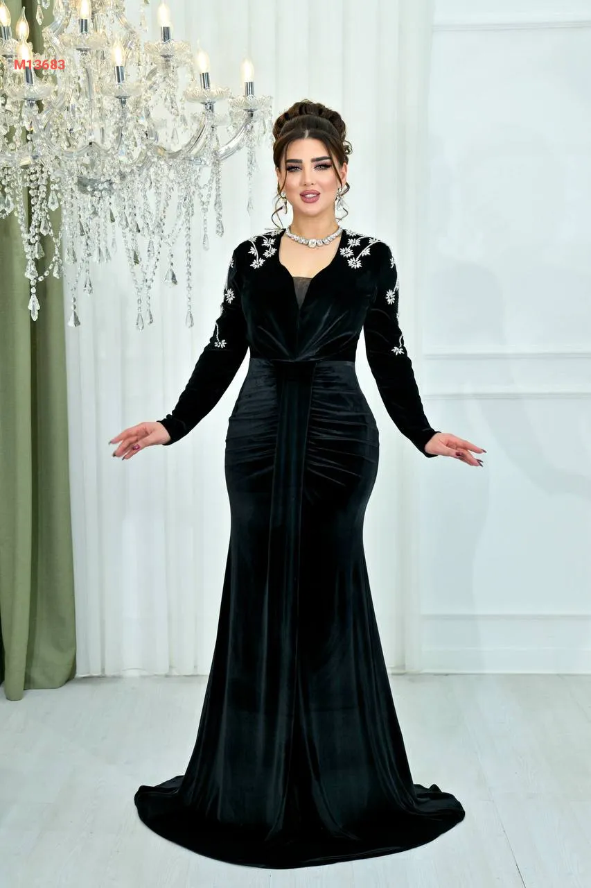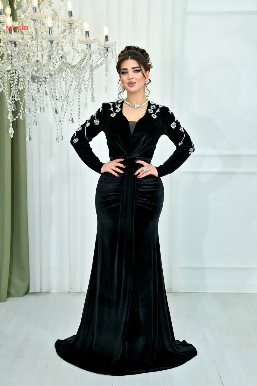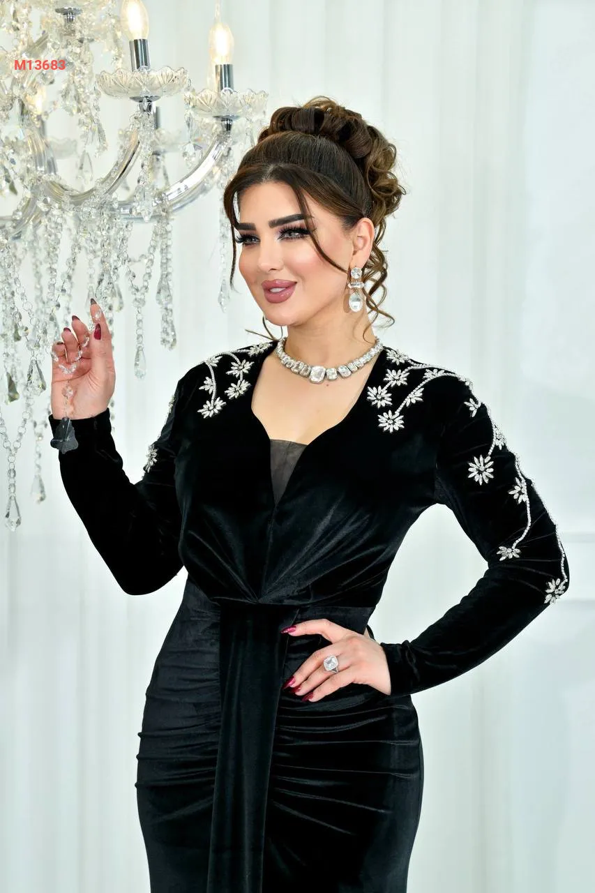 فستان سواريه مخمل بأكمام مرصع بالكريستال والألماس الفضي