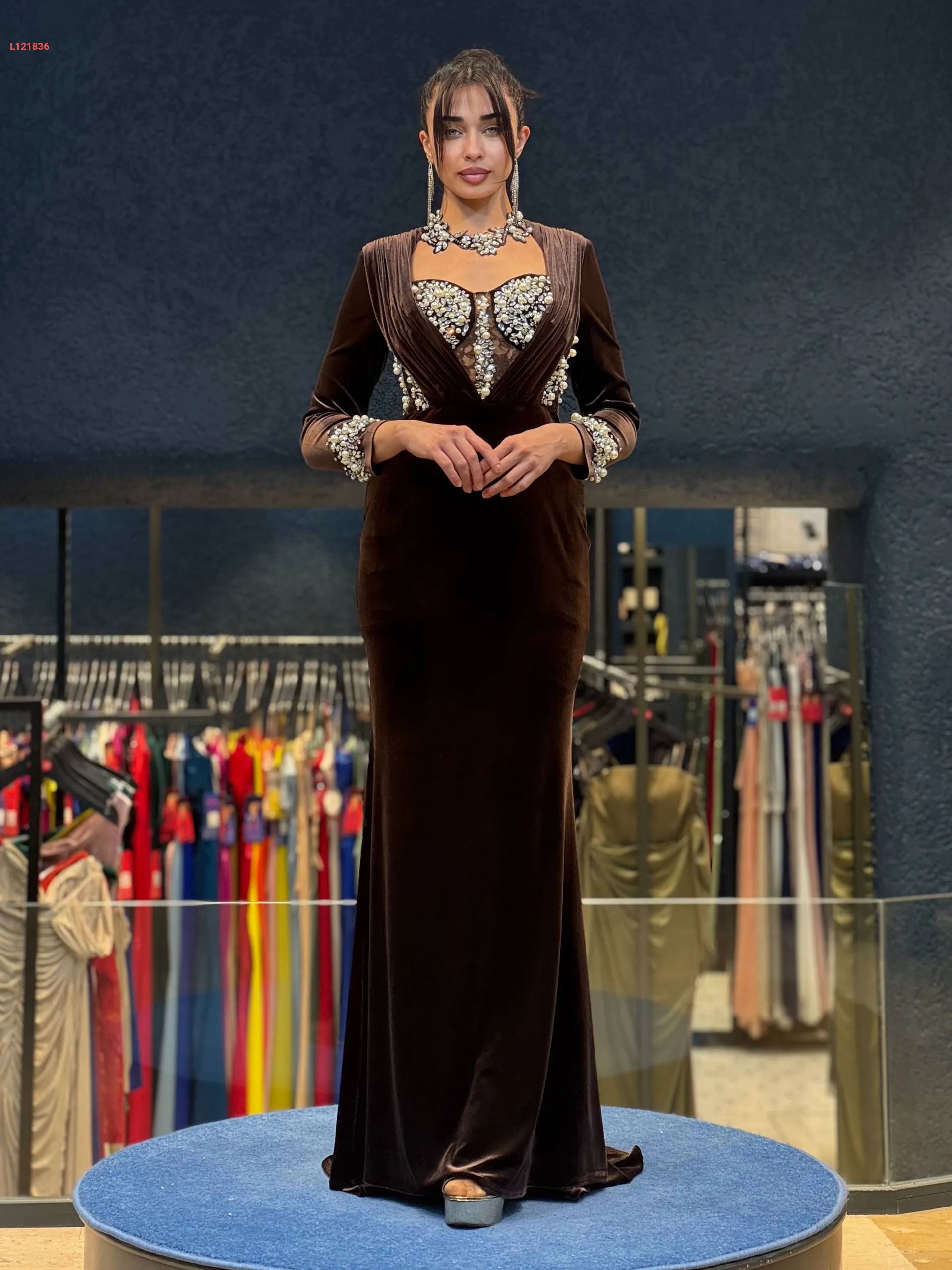 فستان سهرة مخمل كم طويل مرصع من الصدر والكم فاخر