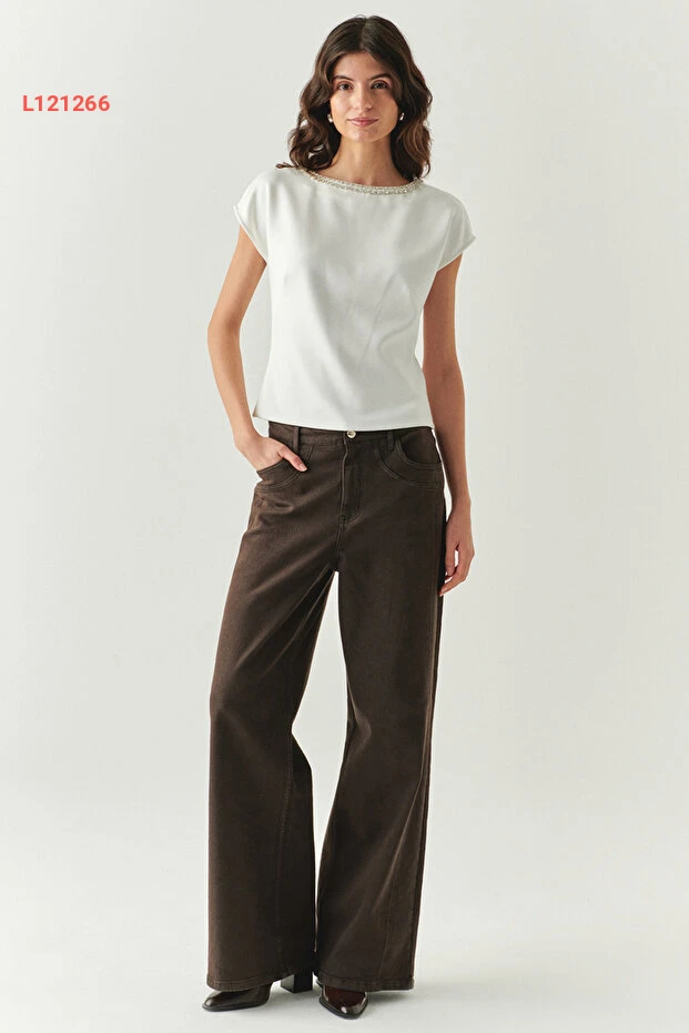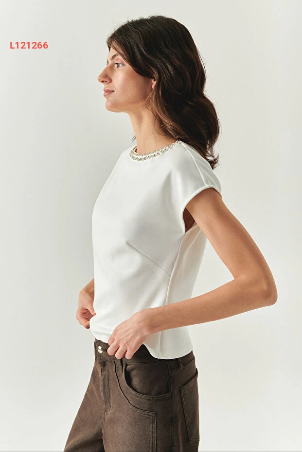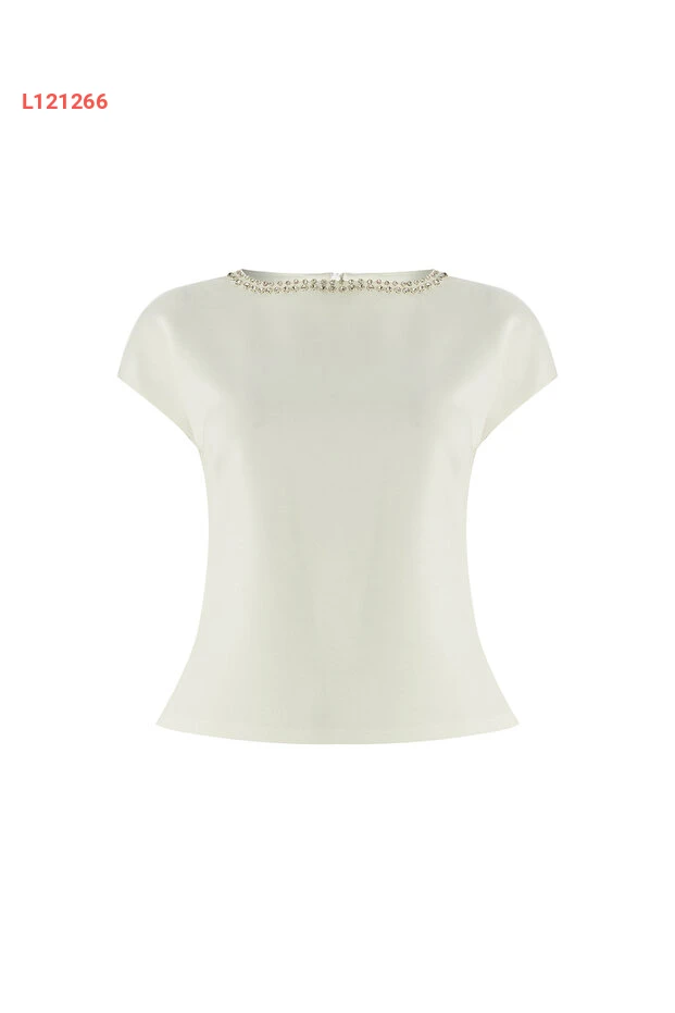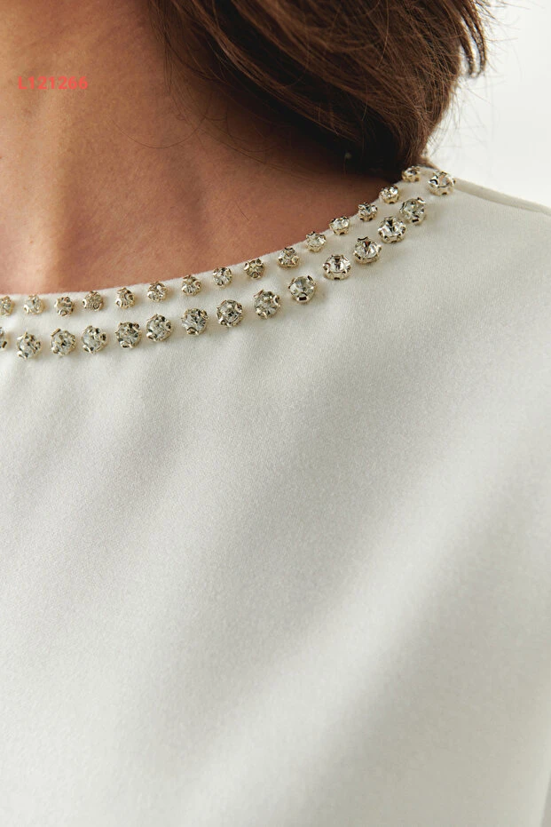 استمتعي بالأناقة والفخامة مع بلوزة "Exquise" ذات التفاصيل الحجرية. تصميمها الكلاسيكي مع ياقة الكاياك بدون أكمام يمنحك إطلالة عصرية مثالية لجميع المناسبات، بينما يضمن الخامات الممتازة راحة تدوم طوال اليوم. ارتديها مع سروال جينز أو تنورة للحصول على مظهر انيق وجذاب.