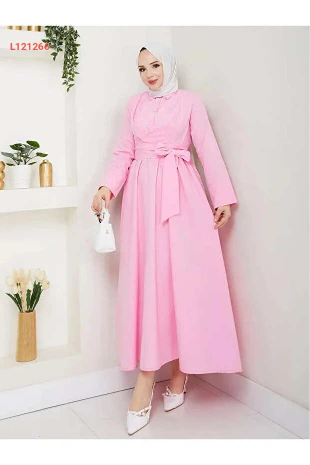 فستان سهرة عصري طويل للمحجبات برباط ثابت باللون الوردي من مجموعة إكزيت