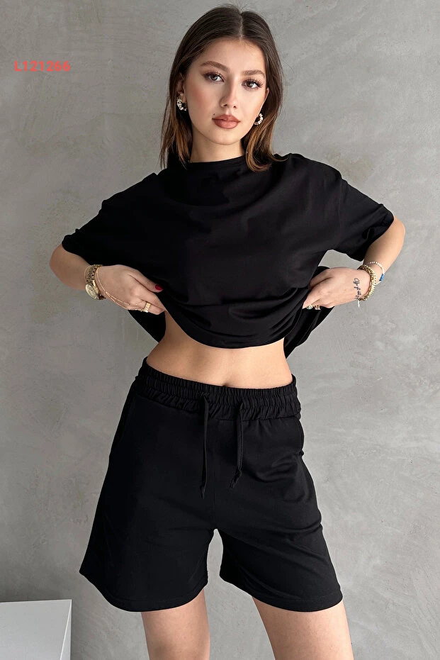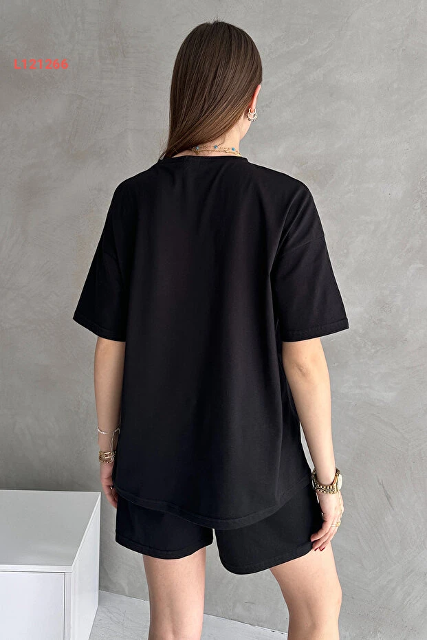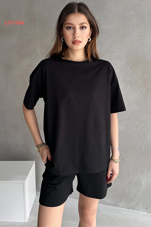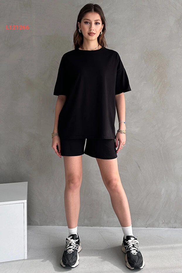طقم نسائي مكون من تيشرت بكم oversized وشورت قطن أسود