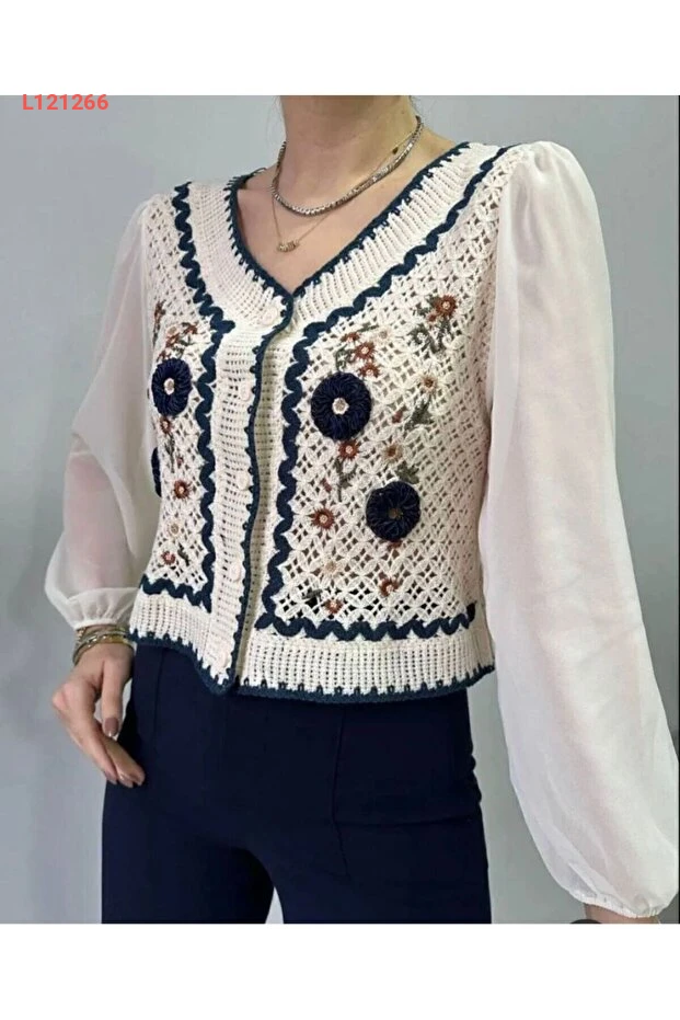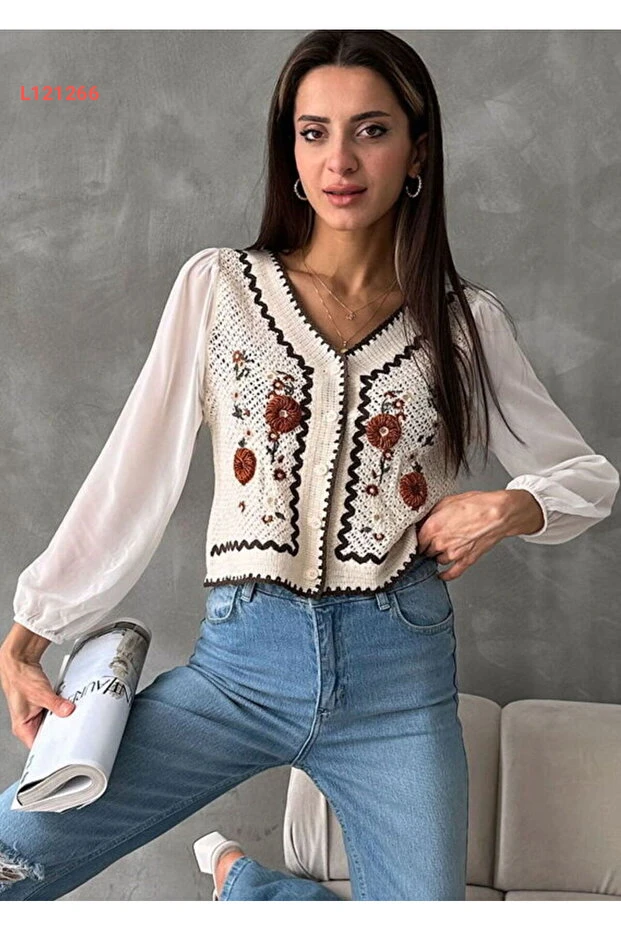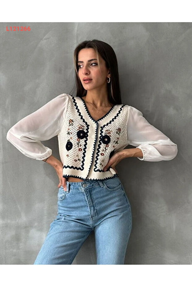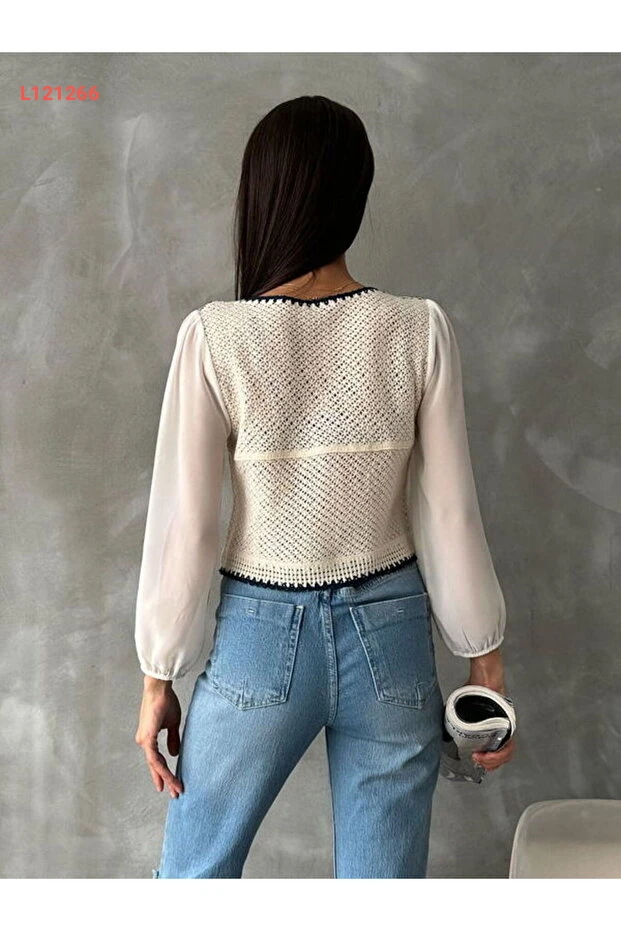 بلوزة كريمة قصيرة بأكمام شيفون مزينة بالدانتيل والنقوش