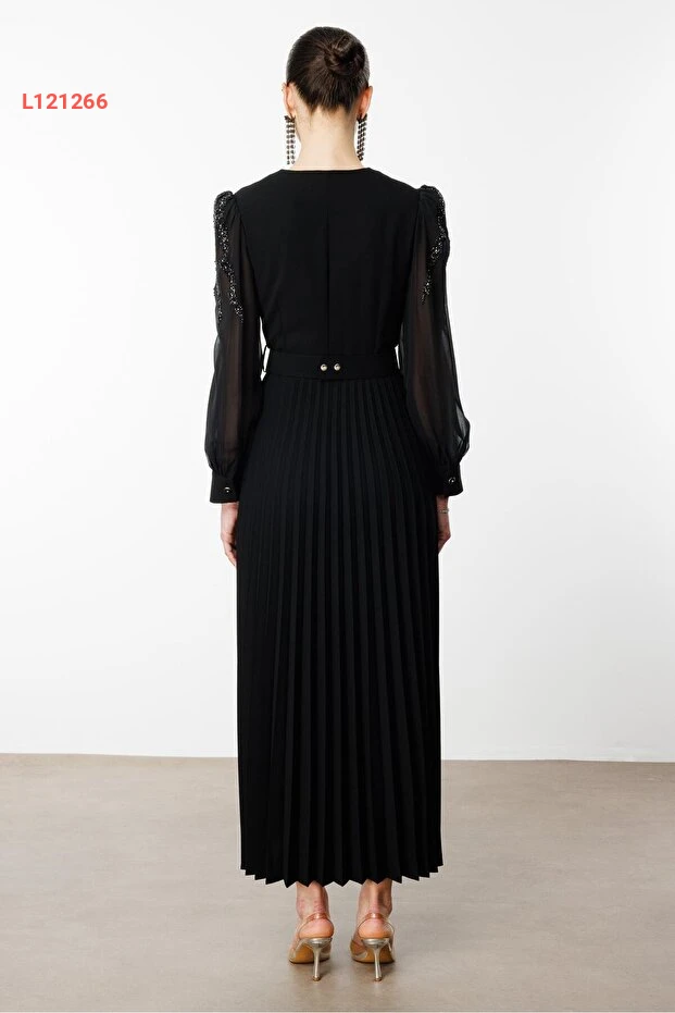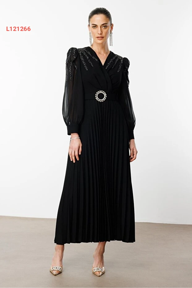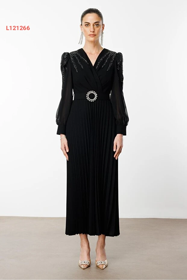 استمتعي بأناقة لا مثيل لها مع فستان "Moda İlgi" السوداء! يتميز بأكمامه المزينة بالحجارة اللامعة وجزء الخصر المحزم، مما يمنحك إطلالة ساحرة وتفاصيل فريدة. مع تصميمه المطوي، يضمن لك الفستان الراحة والرقي في كل مناسبة، ليجعل منك نجمة السهرة!