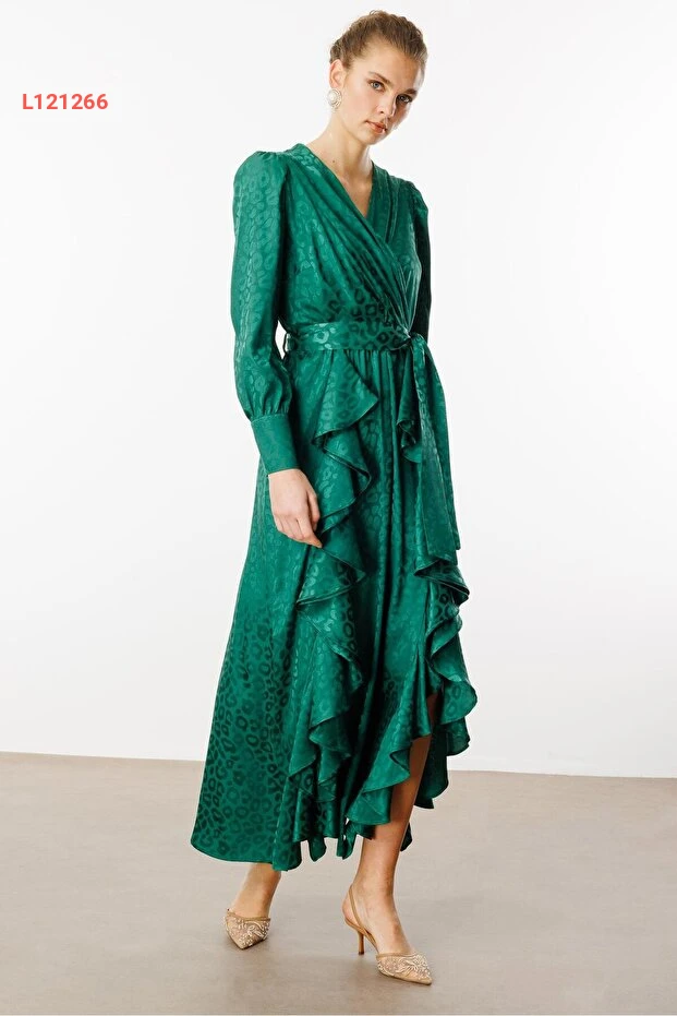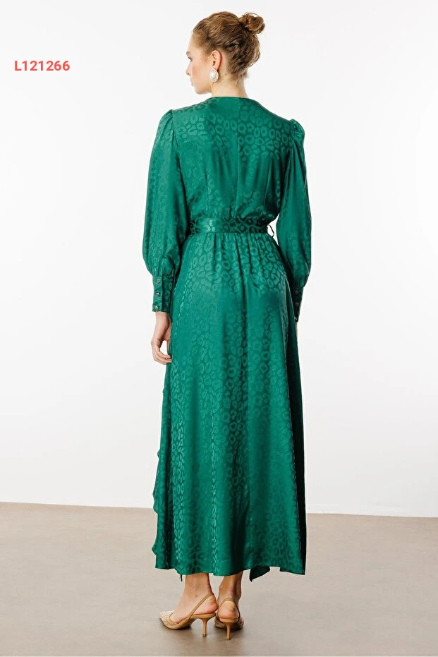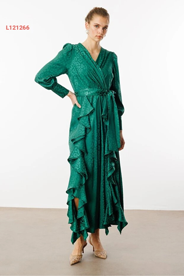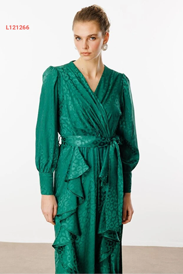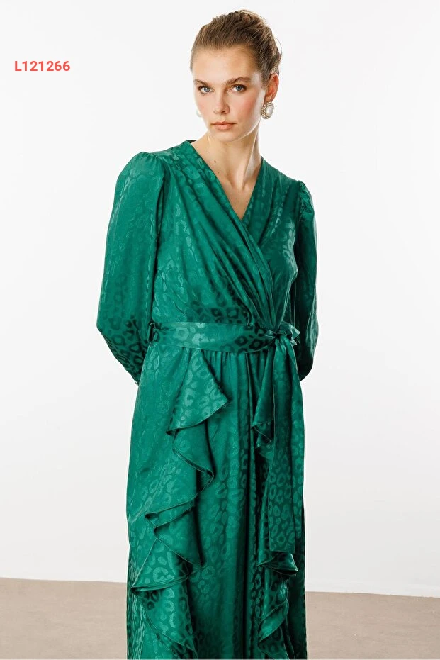 ارتقي بأناقتك مع فستان Moda İlgi ذو التصميم الفريد المكون من طيات مزدوجة ونقوش جاكار. يأتي بلون أخضر جميل، مما يضفي لمسة من الحيوية على إطلالتك. مثالي للمناسبات المختلفة، حيث يجمع بين الراحة والأنوثة في آن واحد.