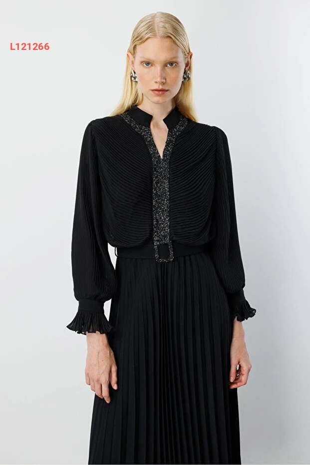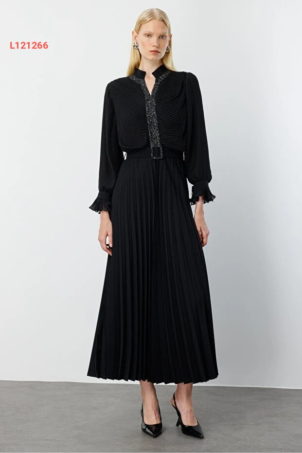 استمتعي بأناقتك الفائقة مع فستان "Moda İlgi" الأسود، الذي يتميز بتصميمه الرائع وجمالياته الفريدة. يأتي هذا الفستان مع تفاصيل ملائمة وجذابة من الحجارة اللامعة وطيات أنيقة تعزز من أنوثتك، مما يجعله خيارًا مثاليًا لمناسباتك الخاصة. ارتدي الفستان وكوني محط الأنظار بأناقتك الساحرة!