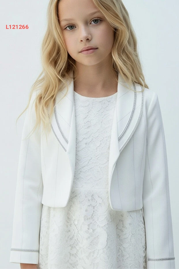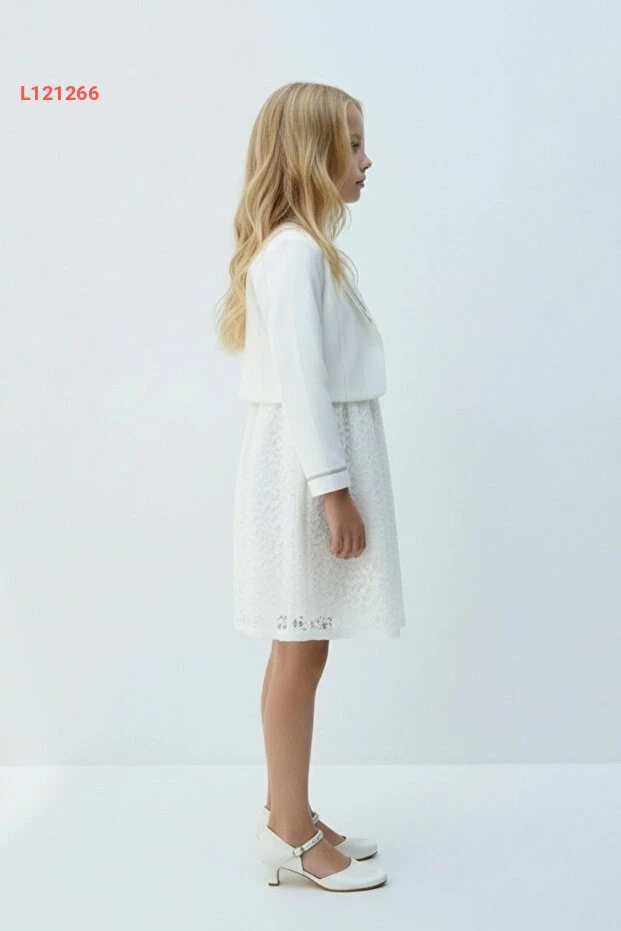 اجعلوا لحظاتهن مميزة مع طقم فستان دانتيل فخرية كيدز! يتميز هذا الطقم الجميل بفتحة الدانتيل الرائعة والجاكيت الأنيق الذي يوفر الدفء والراحة في الأجواء المختلفة. مثالي للشعرات الخاصة والمناسبات، سيضيف لمسة من السحر والأناقة إلى إطلالة طفلتك.