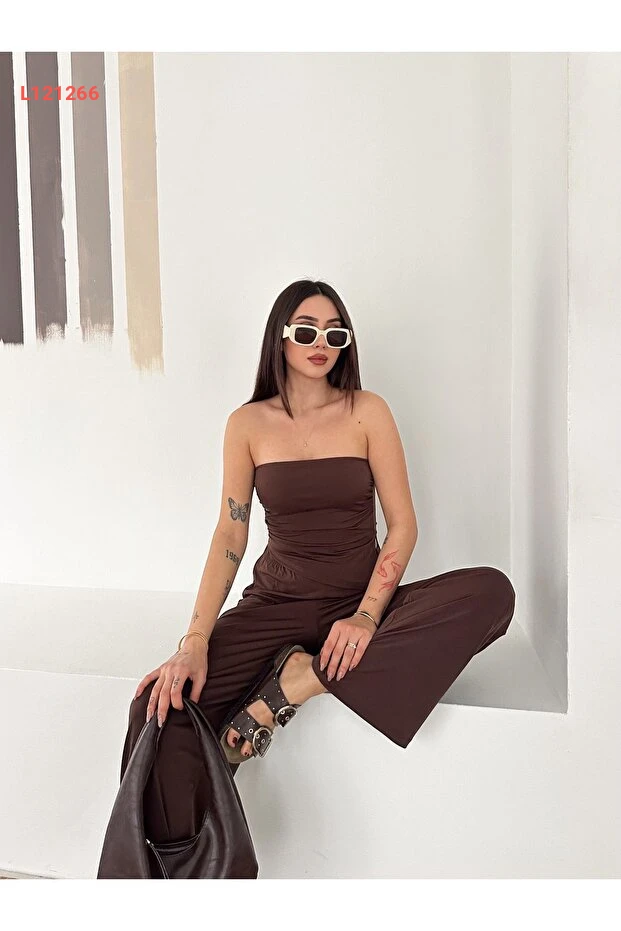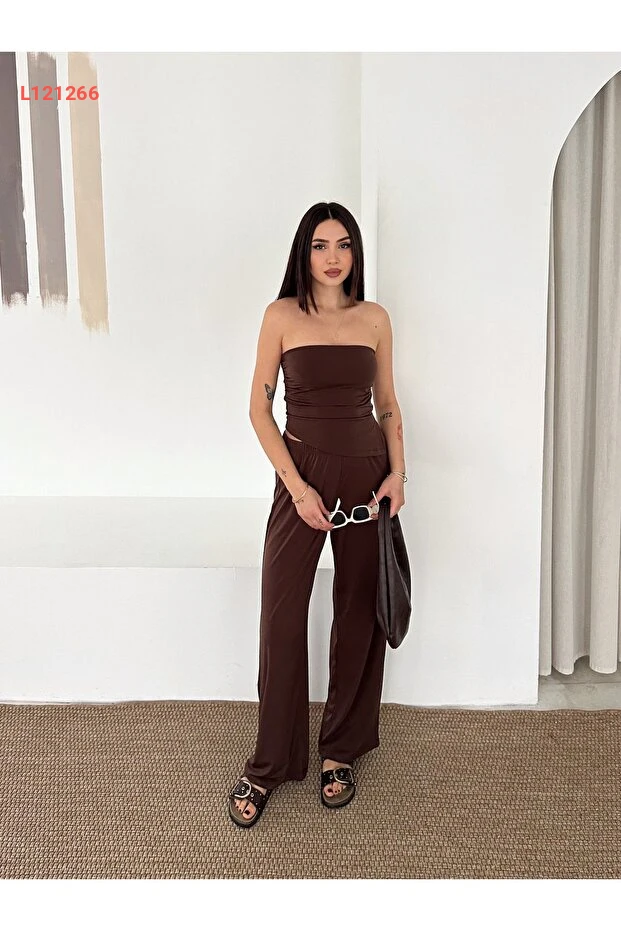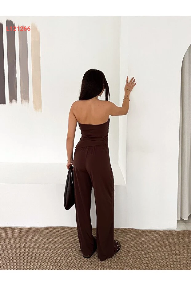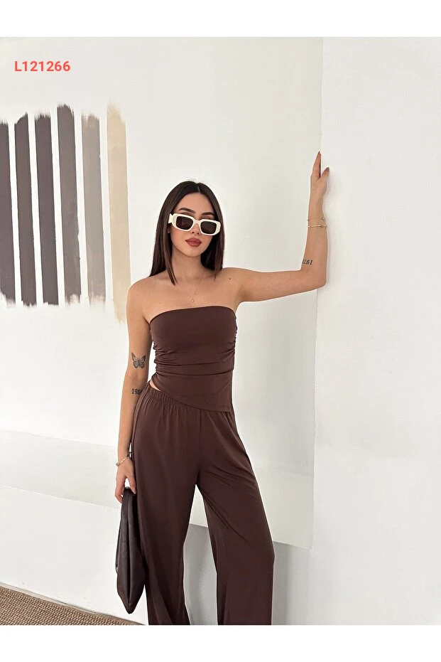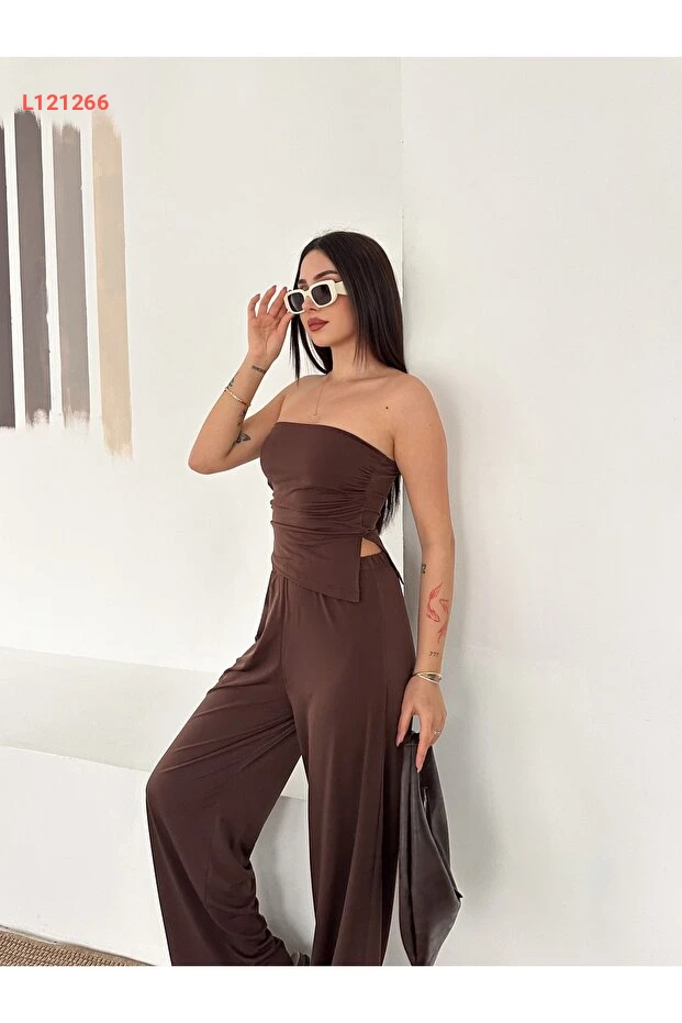 تألقي بأناقتك مع مجموعة FEWTİNT، التي تتميز بتصميمها العصري مع قصة غير متكافئة وتفاصيل شق جانبي جذابة. يضمن لك الجزء العلوي بدون حمالات والمزود برباط مناسب الراحة والأناقة، بينما توفر لك السراويل مع الحزام المرن مظهرًا فريدًا يجمع بين الأسلوب والراحة طوال اليوم. اجعلي إطلالتك لا تُنسى مع هذه المجموعة المثالية لكل المناسبات!