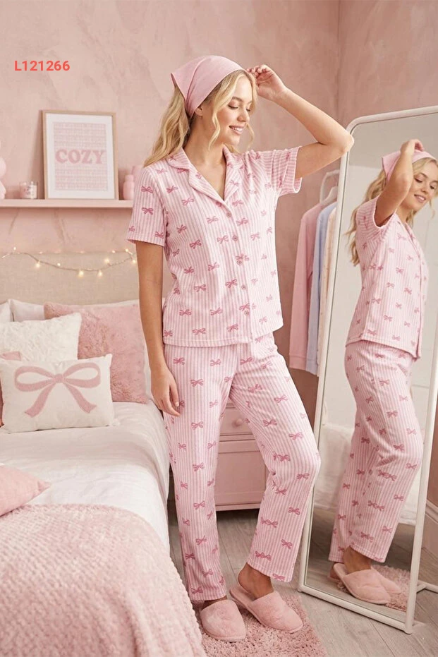 بيجامة قصيرة الأكمام مزينة بشريط وردي من فِت وِمن - موديل 6064