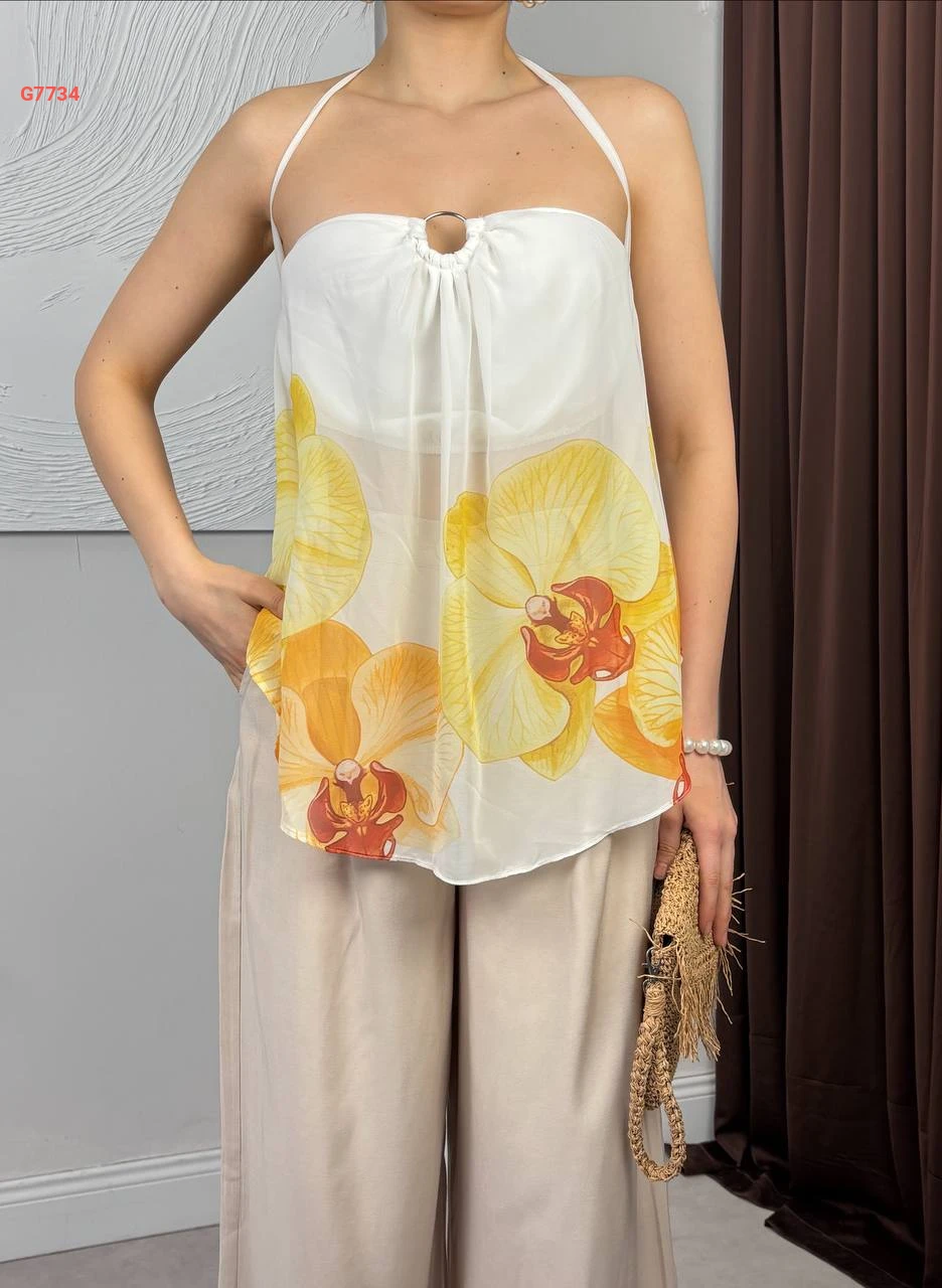 بلوزة موردة بربطة خلفية عالرقبة