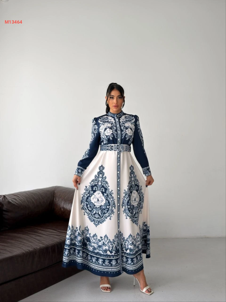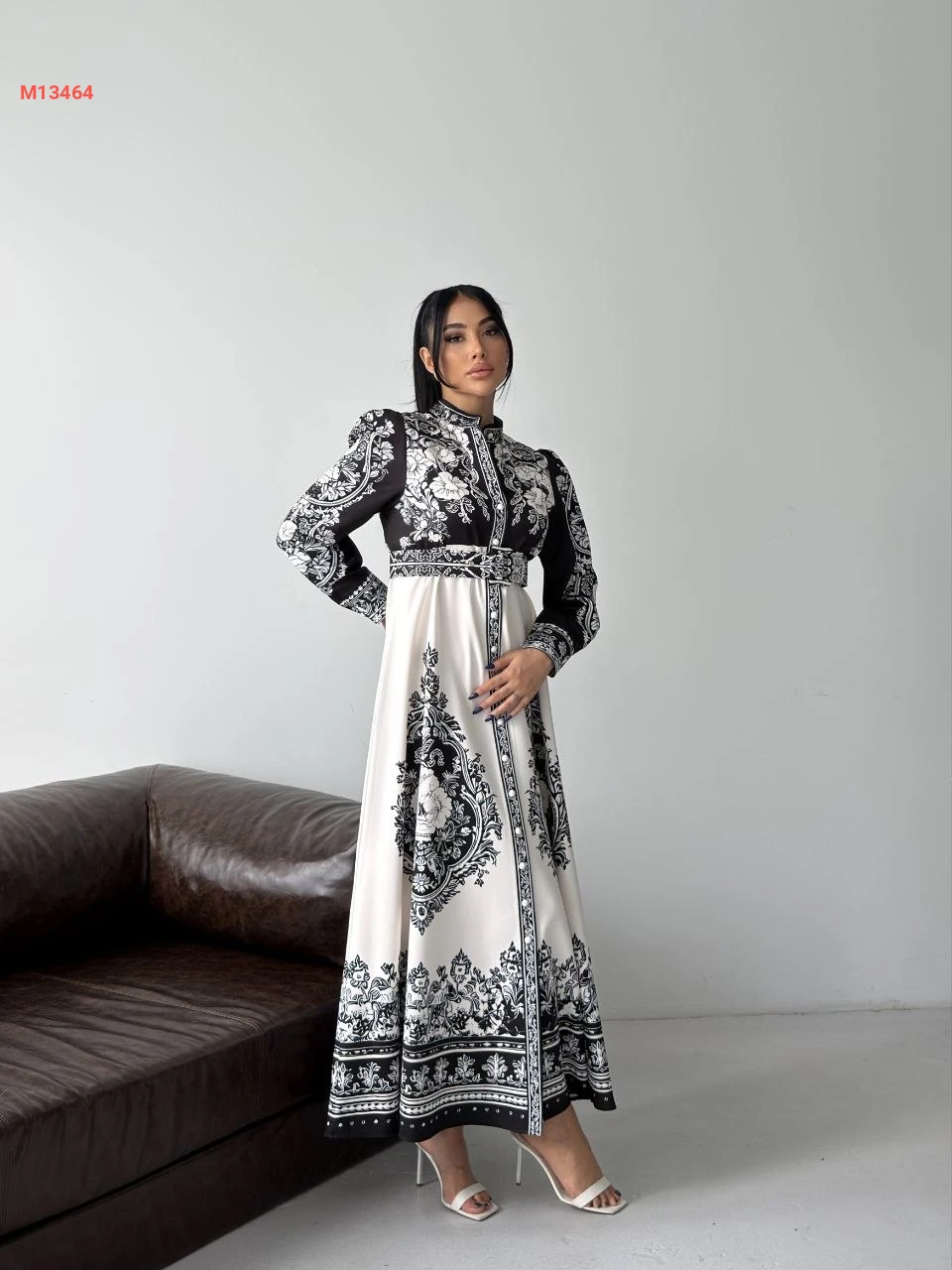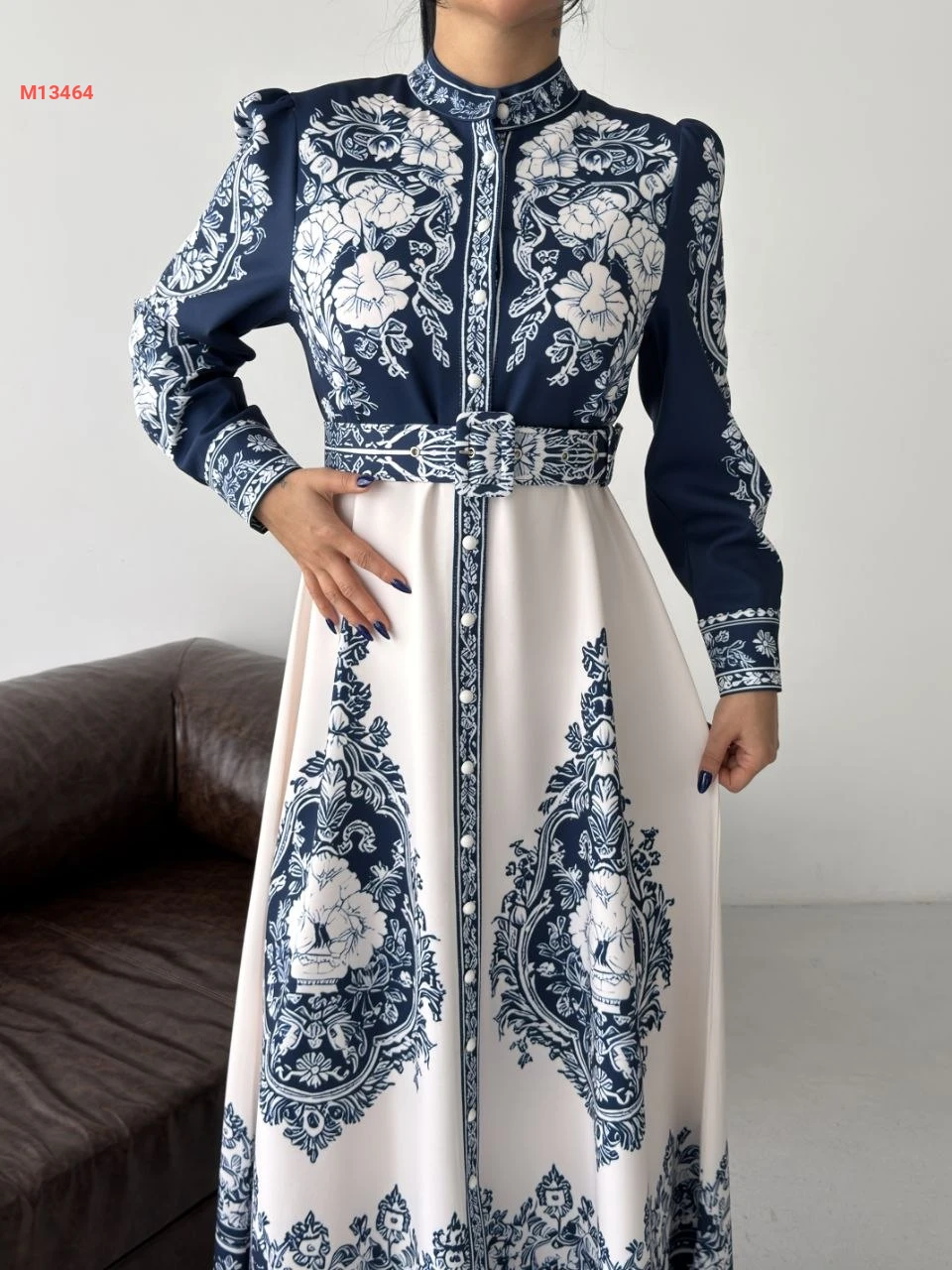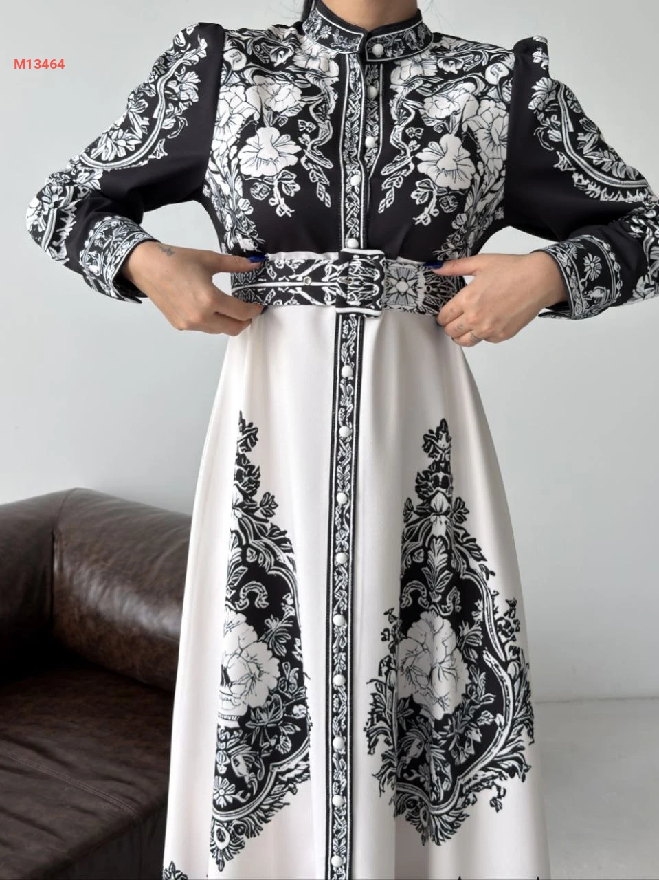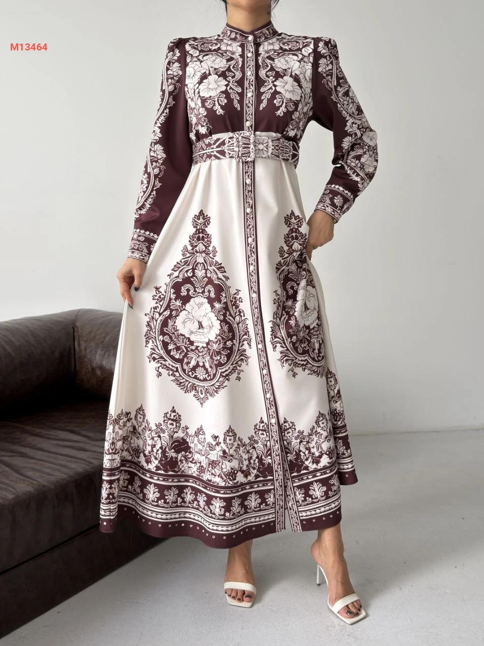 فستان طويل منقوش بأزرار