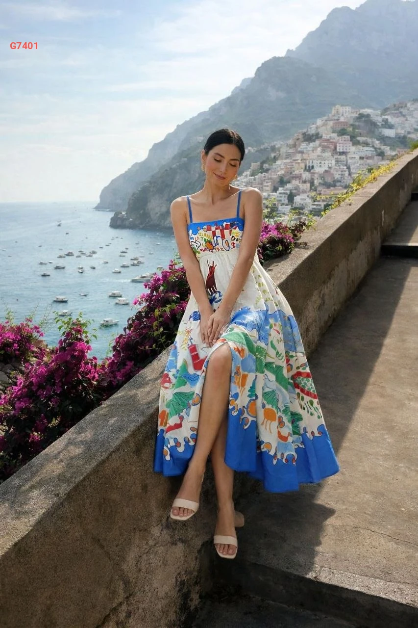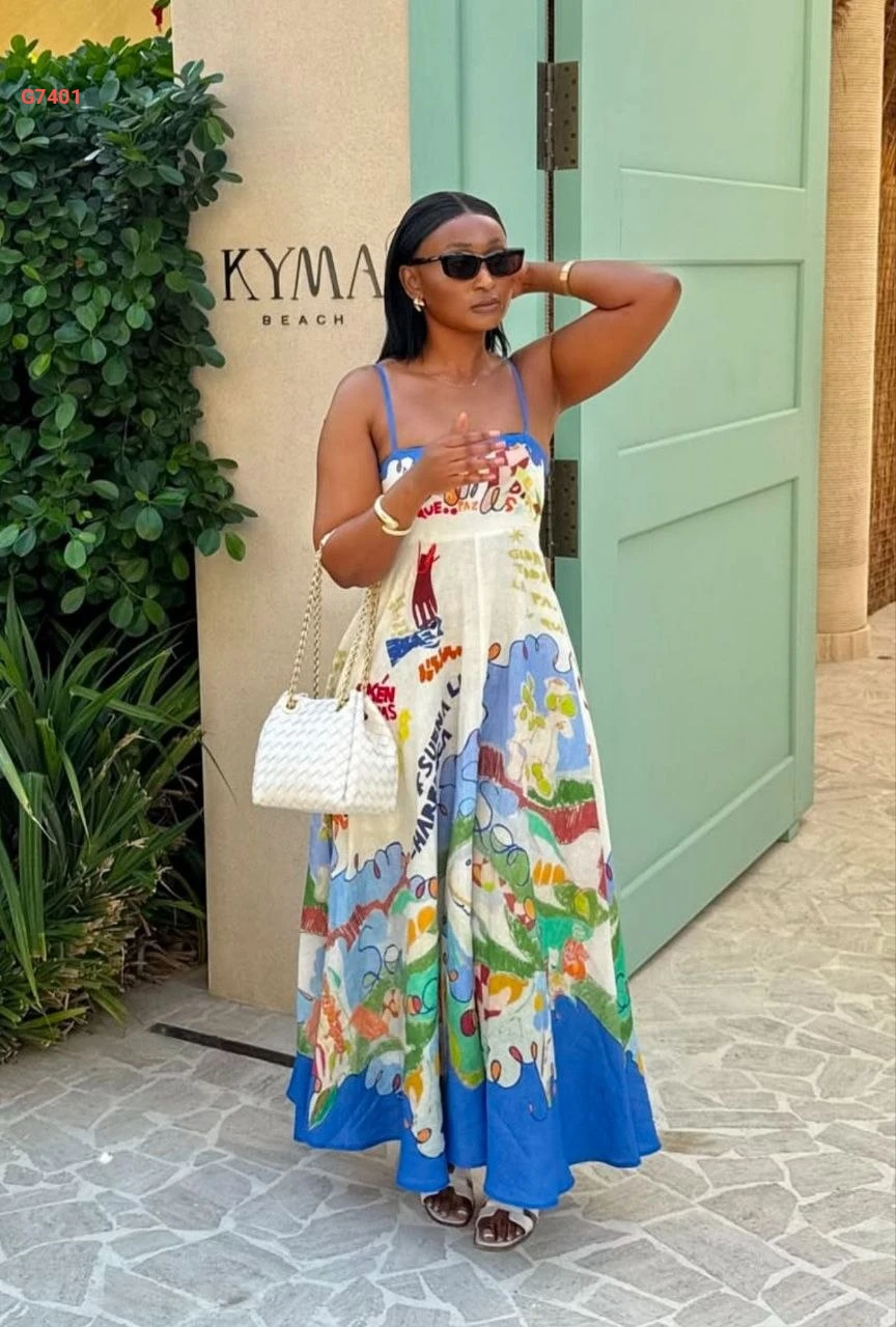 فستان طويل مطبع بحمالات رفيعة