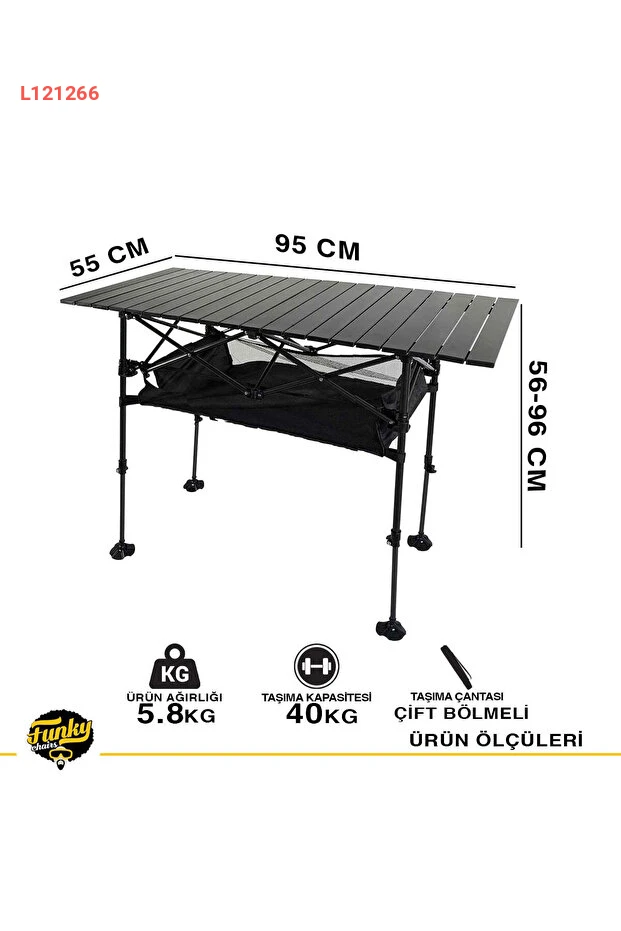 استمتع بتجربة تخييم مريحة مع طاولة الكامب المتطورة من فانكي تشيرز، المصنوعة من الألمنيوم الخفيف والقوي. تتميز بخاصية الطي والتلسكوبية، مما يسهل حملها وضبط ارتفاعها بين 68 إلى 96 سم لتناسب احتياجاتك، بينما تصميمها الأسود الأنيق يضيف لمسة عصرية إلى مغامراتك في الهواء الطلق.