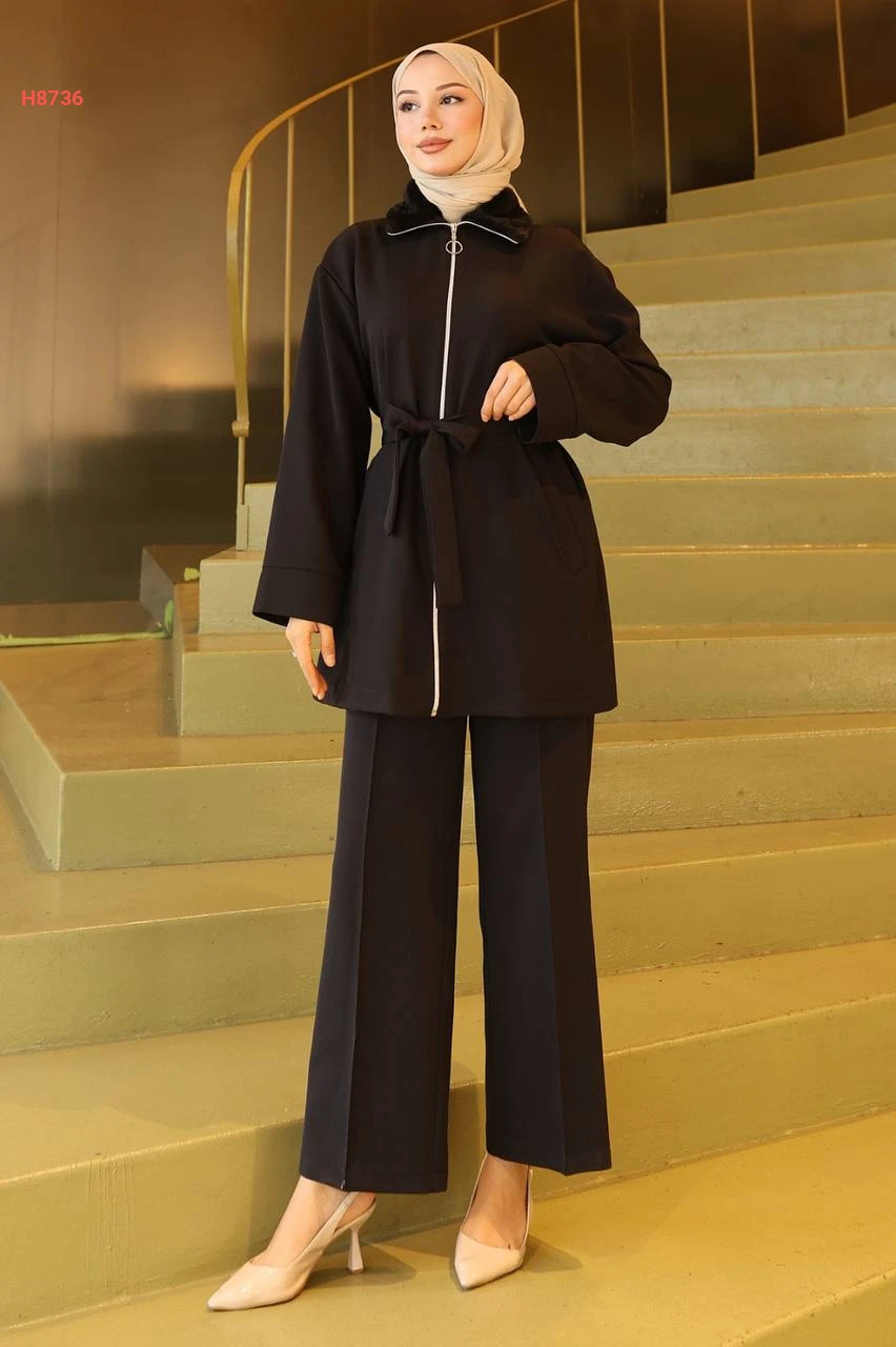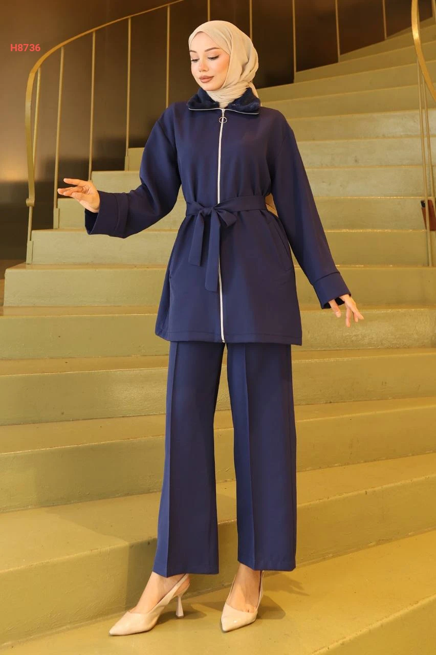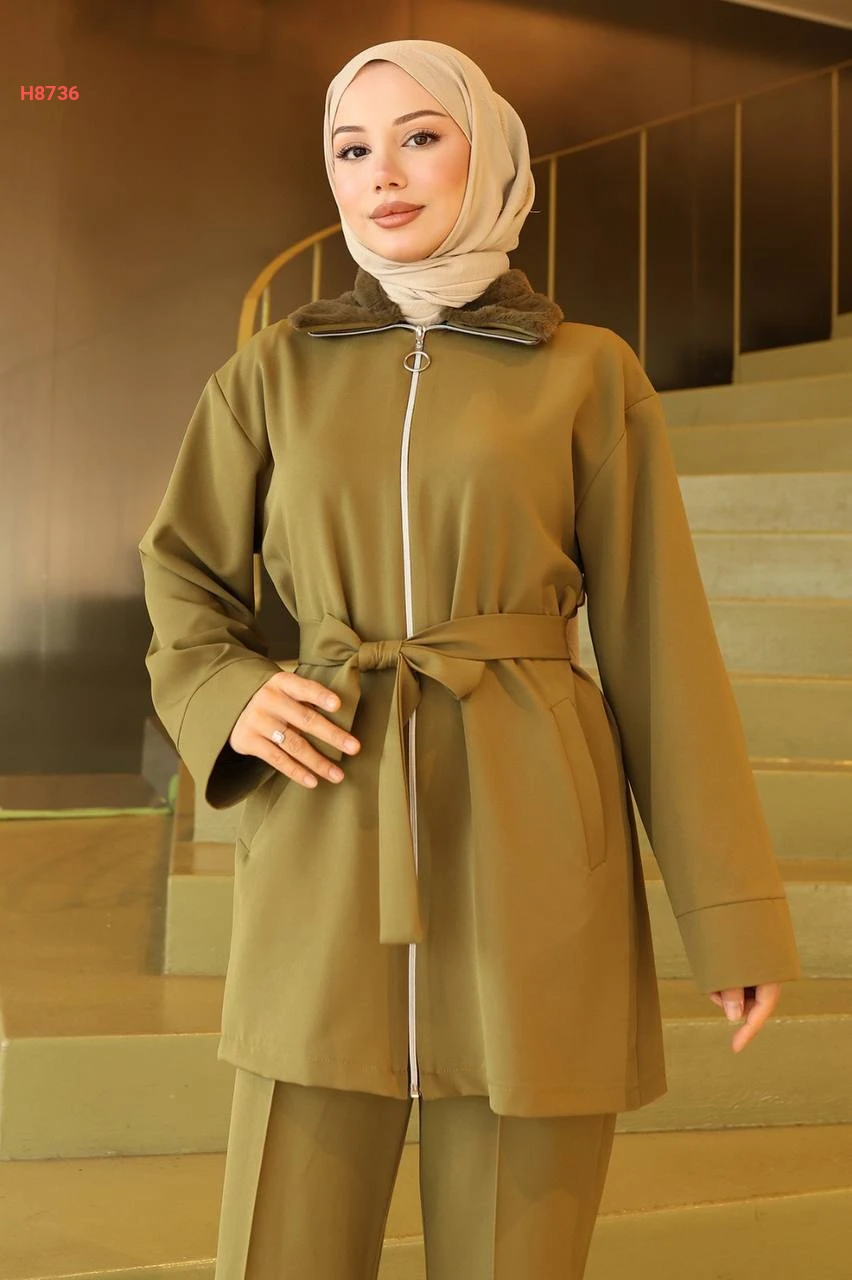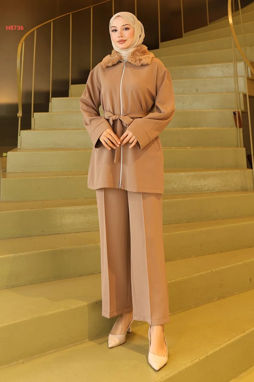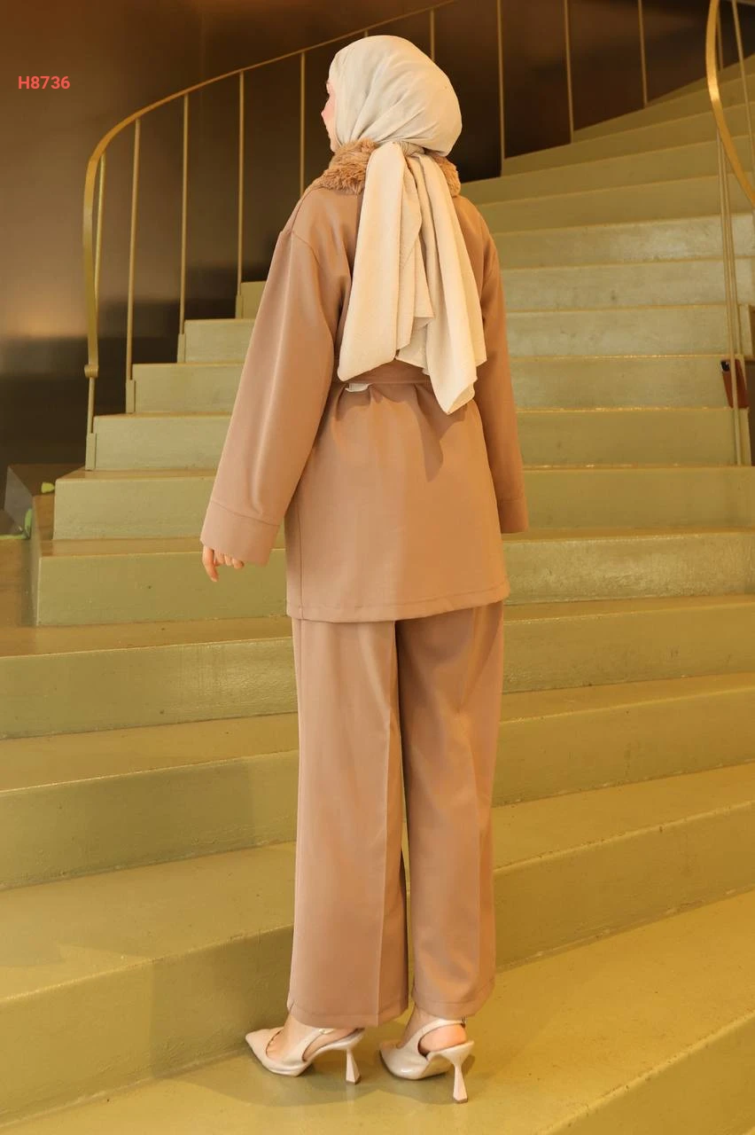 طقم جاكيت قبة فرو مع بنطال محجبات