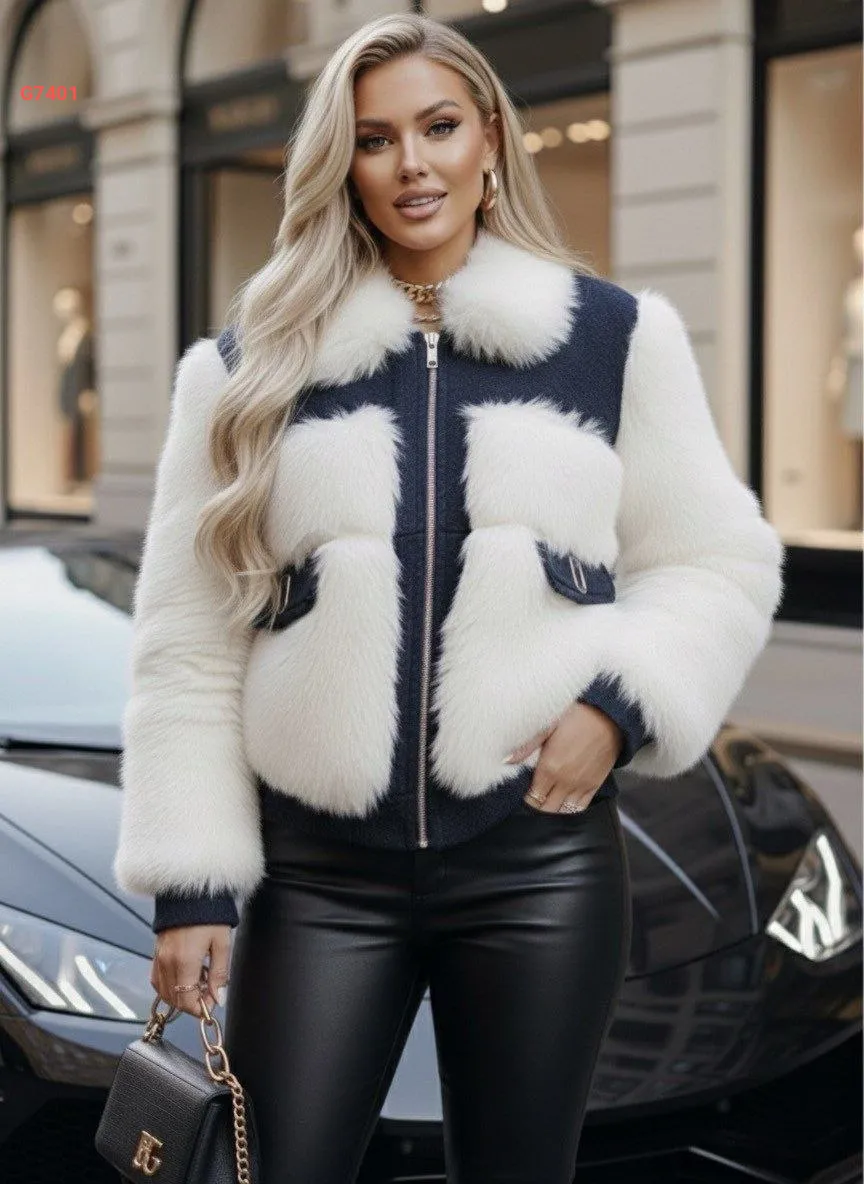 جاكيت فرو وجينز قصير بسحاب