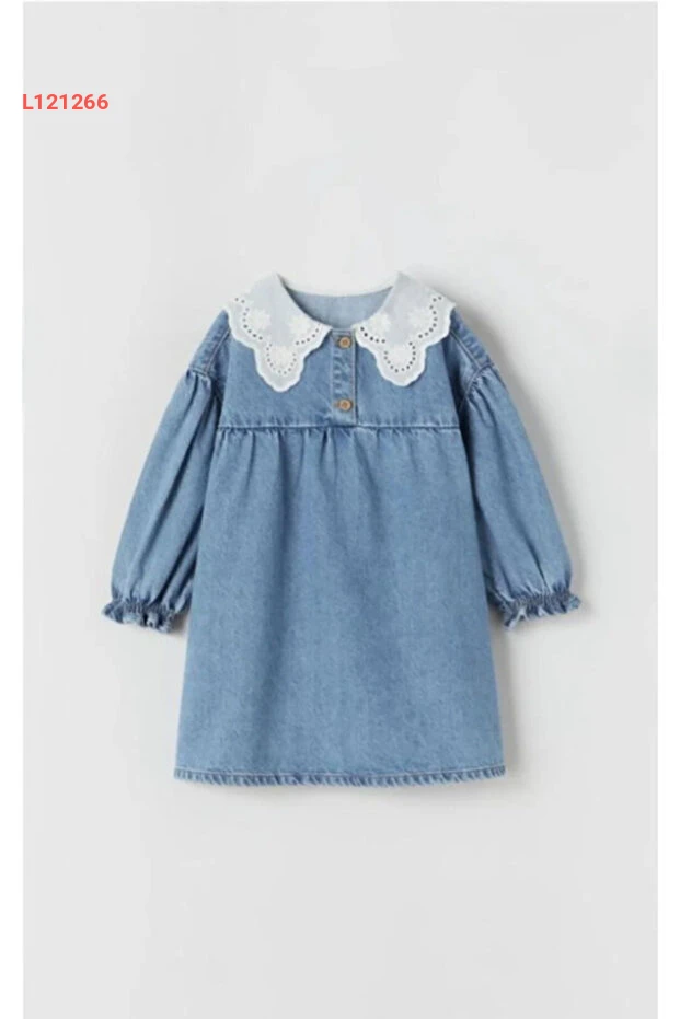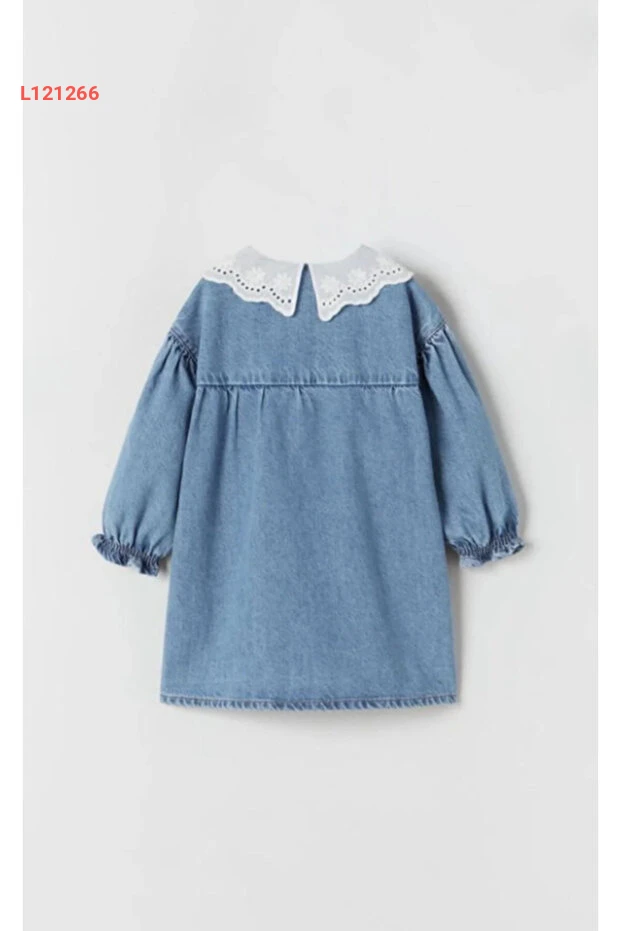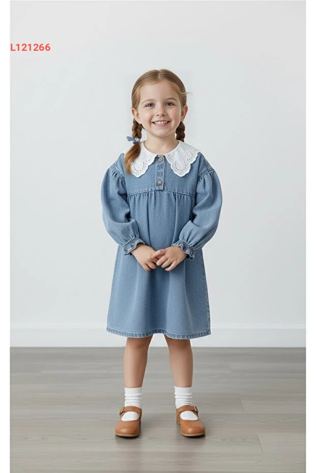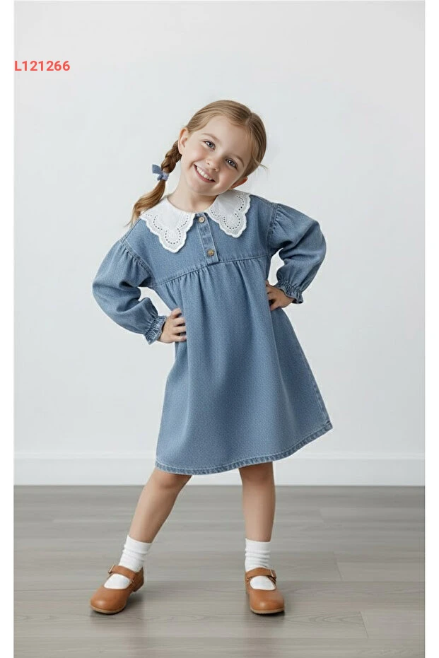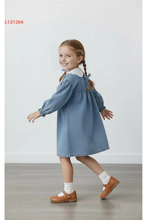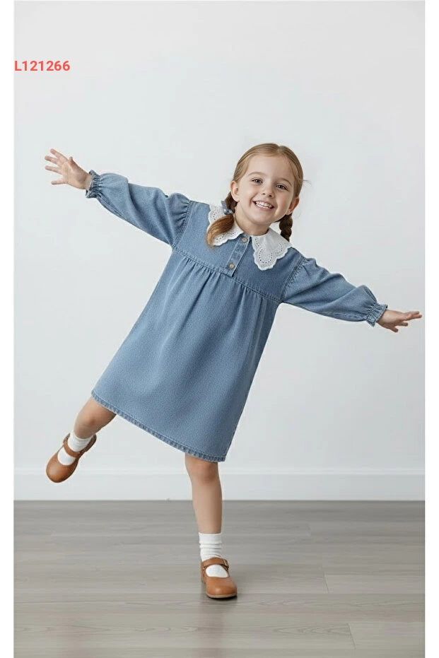 فستان جينز للأطفال جميلة بتصميم عباة بأكمام طويلة وياقة دانتيل