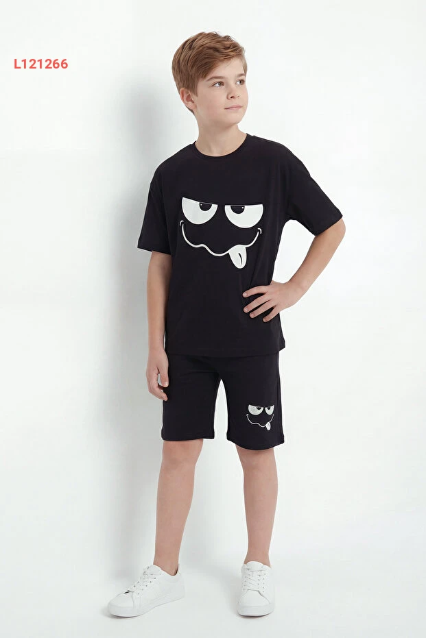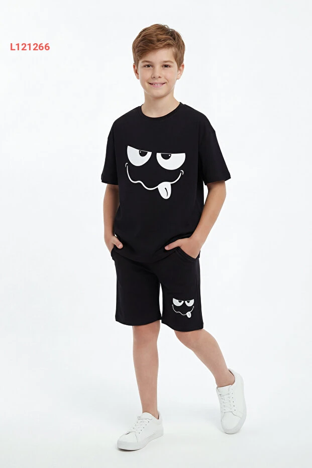 طقم صيفي مكون من شورت وتيشيرت بأكمام قصيرة للأطفال الأولاد مع طباعة إيموجي لطيفة