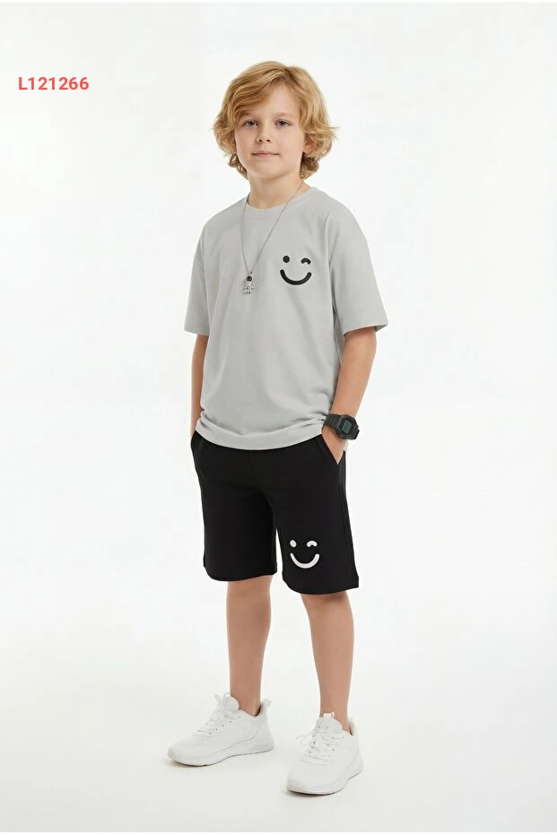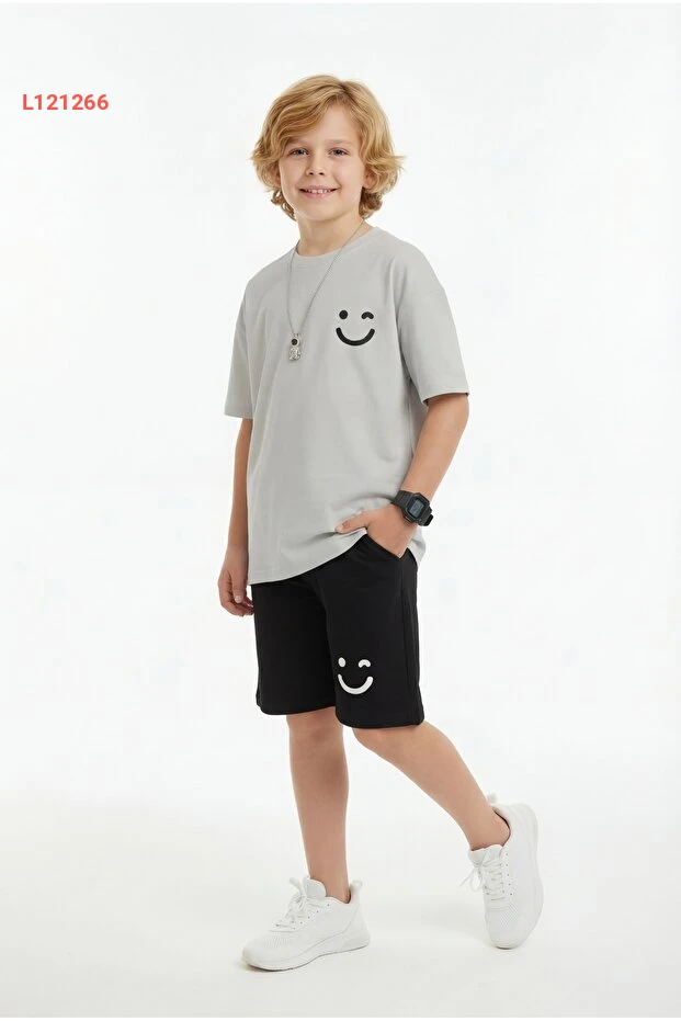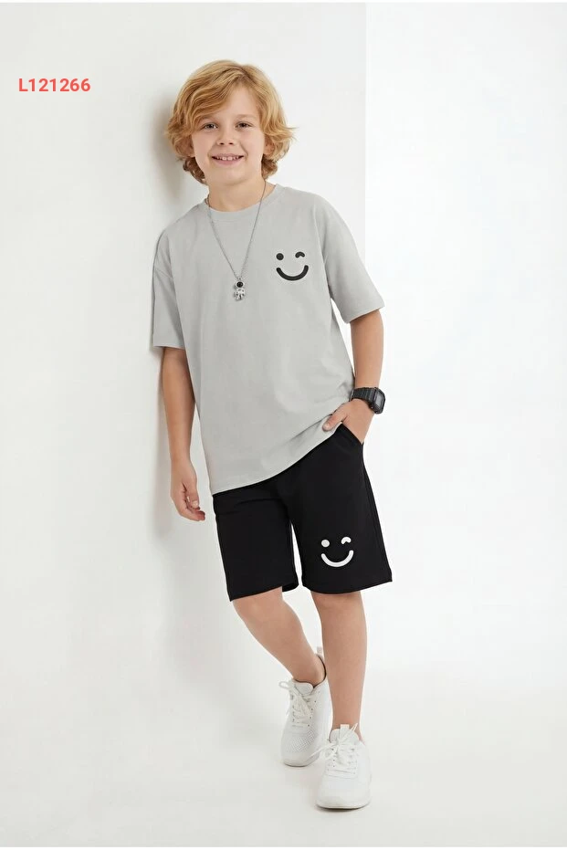 طقم صيفي أولاد بأكمام قصيرة مع طباعة إيموجي وقلنسوة مستديرة