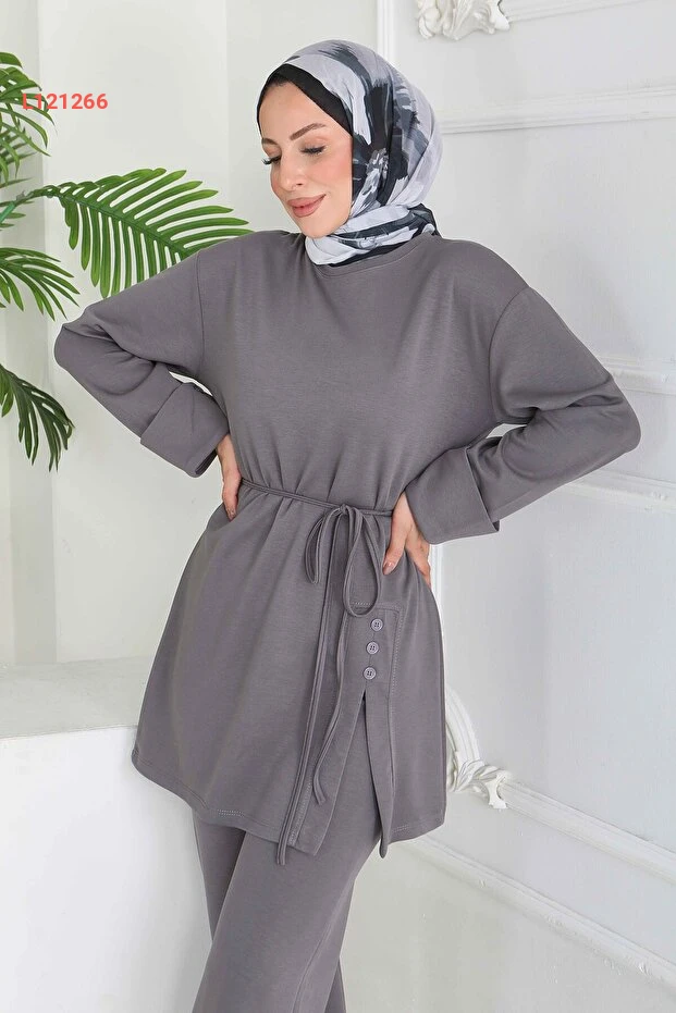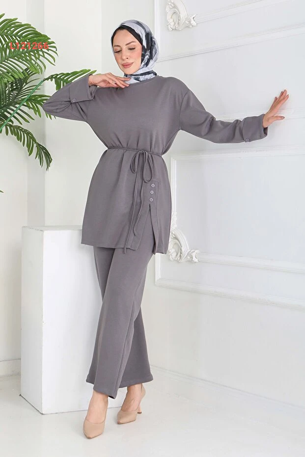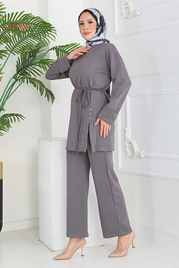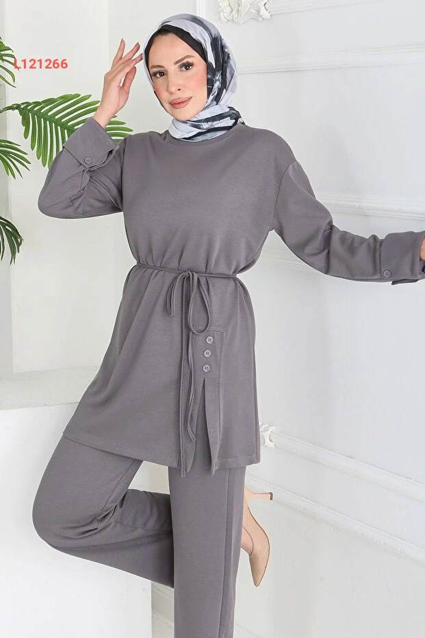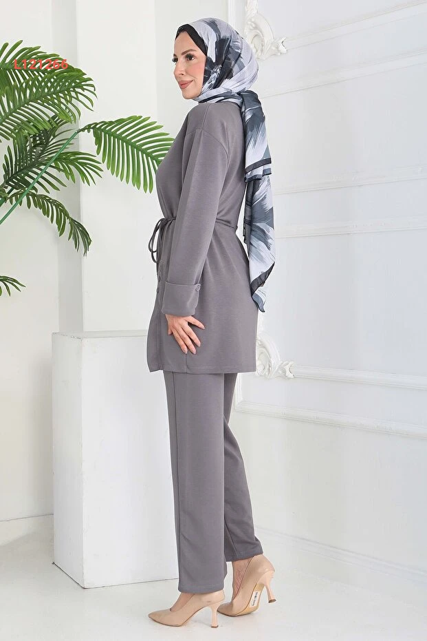 طقم مودال مزدوج بتفاصيل أزرار - رمادي