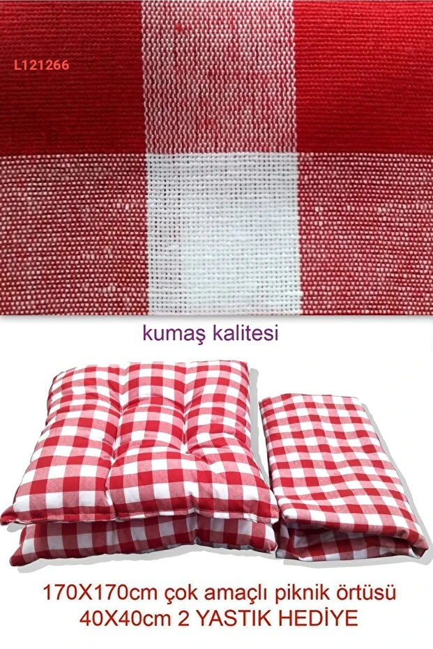 استمتع بأوقاتك في الهواء الطلق مع مجموعة "جنل ماركار" لتجهيزات النزهات! يأتي طقم النزهة مع غطاء مميز بلون الأحمر الجذاب ووسادتين هديتين، مما يضمن لك الراحة والأناقة أثناء استمتاعك بأمسية رائعة. قياسات الطقم المثالية (40x40 سم و120 سم) تجعله مثالياً للنزهات، سواء في الحدائق أو على الشاطئ.