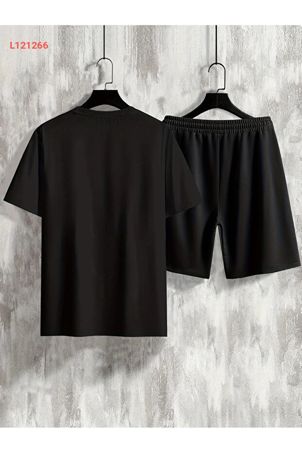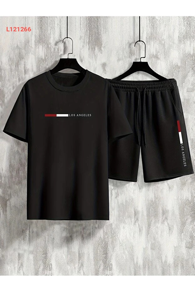 تي شيرت وشورت رجالي أسود بأكمام قصيرة مزين بطبعة لوس أنجلوس - تصميم فضفاض