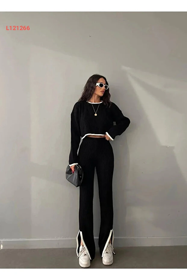 طقم بنطلون كروب ذو تفاصيل خطية - ميلانو 2 قطعة باللونين الأسود والأبيض 2026