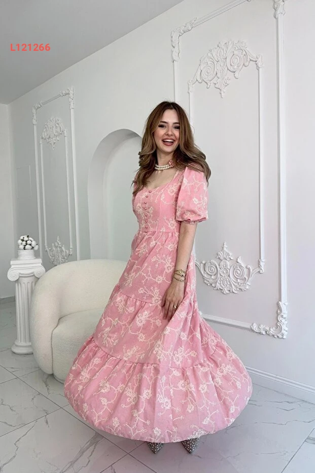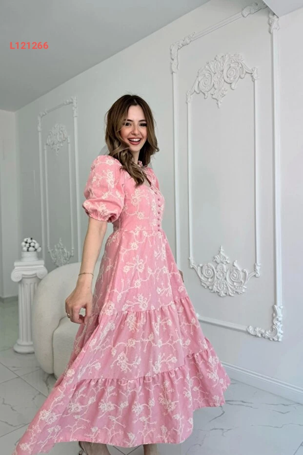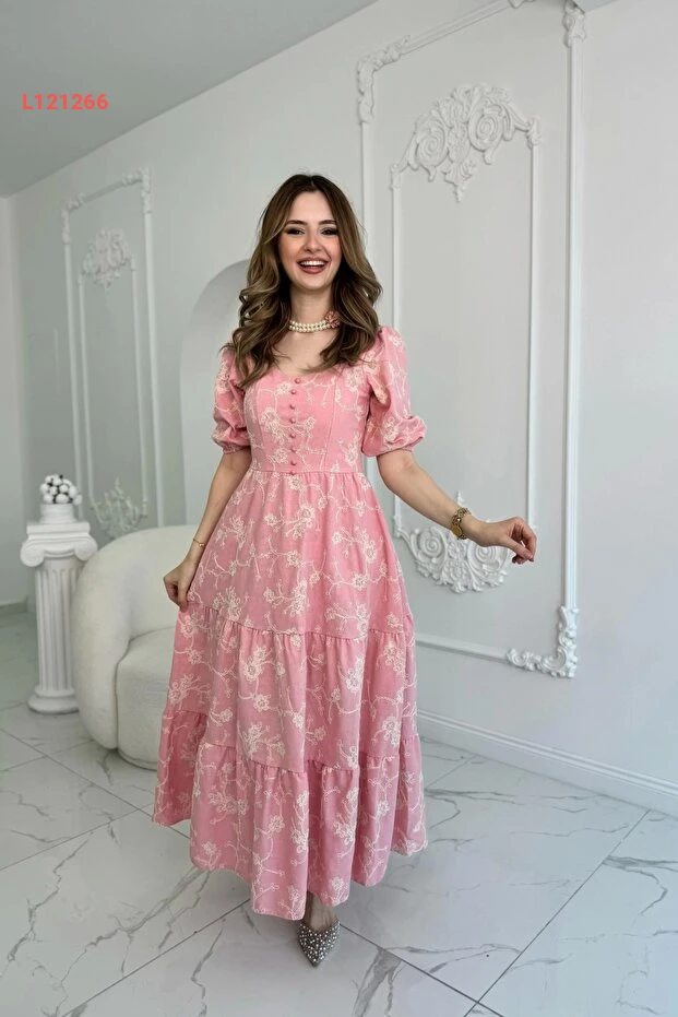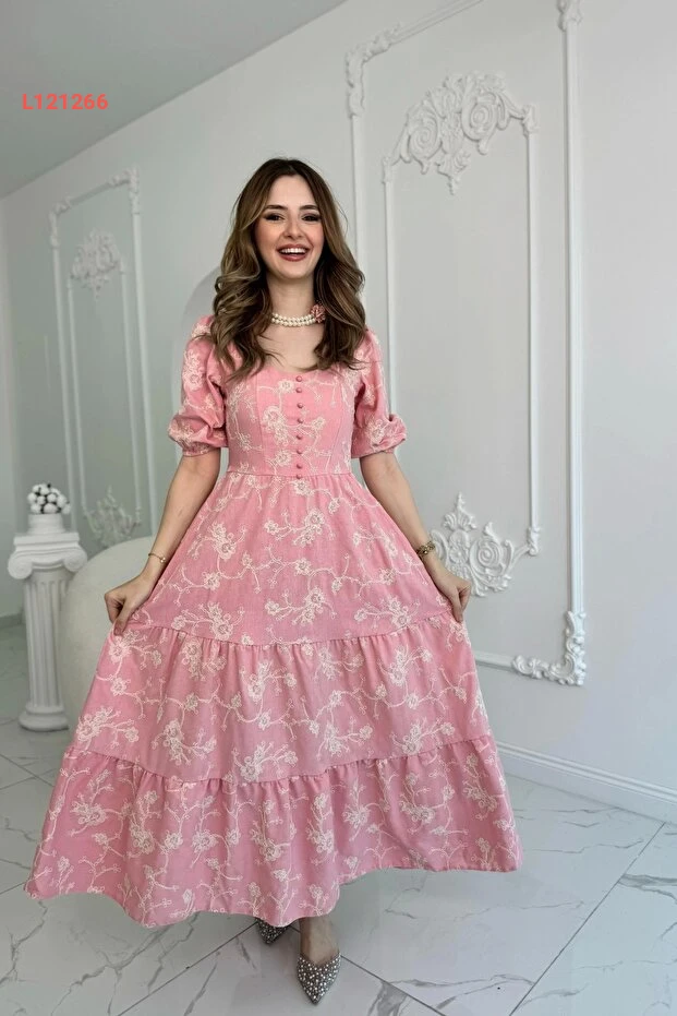 استمتعي بأناقة لا مثيل لها مع فستان Genel Markalar ذو الأكمام المنتفخة المزينة بالدانتيل! مصنوع من الكتان الخفيف، يجمع بين الراحة والجمال، بينما تضفي الأزرار الوردية لمسة أنثوية رائعة. ارتدي هذا الفستان في مناسباتك المميزة لتتألقين بأسلوب فريد وجذاب.