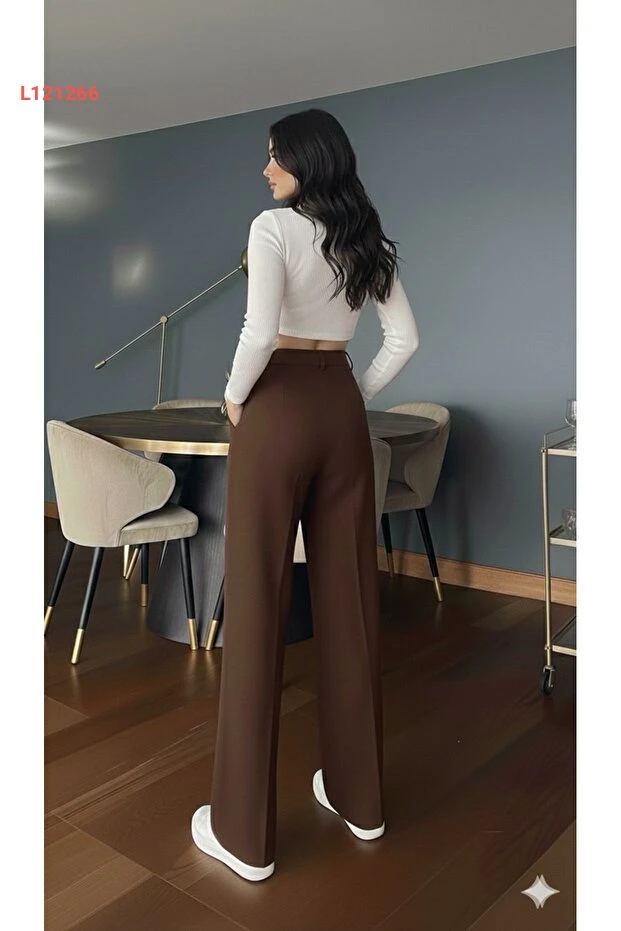 سروال بالازو نسائي بني عالى الخصر مع تفاصيل زر وطيّات من قماش مرن