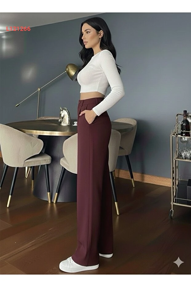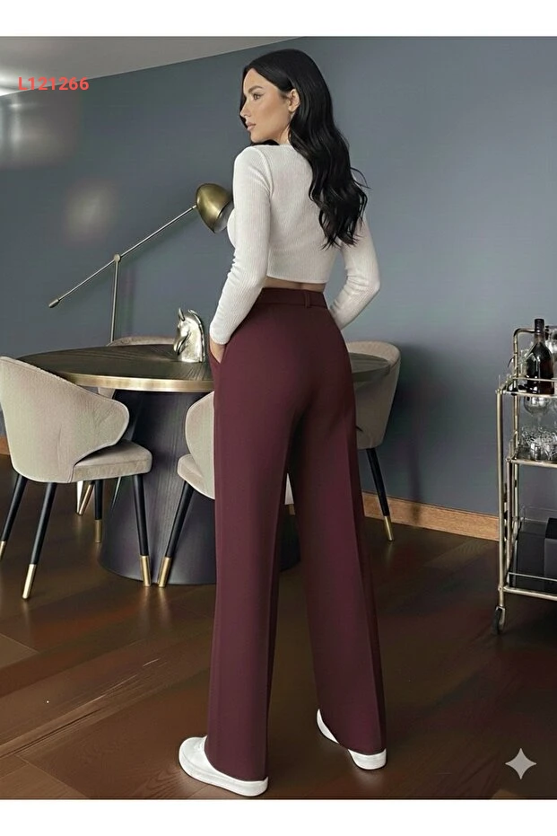 بناطيل بالازو بوردو علوية عالية للنساء مع تفاصيل زر وطيات من قماش مرن