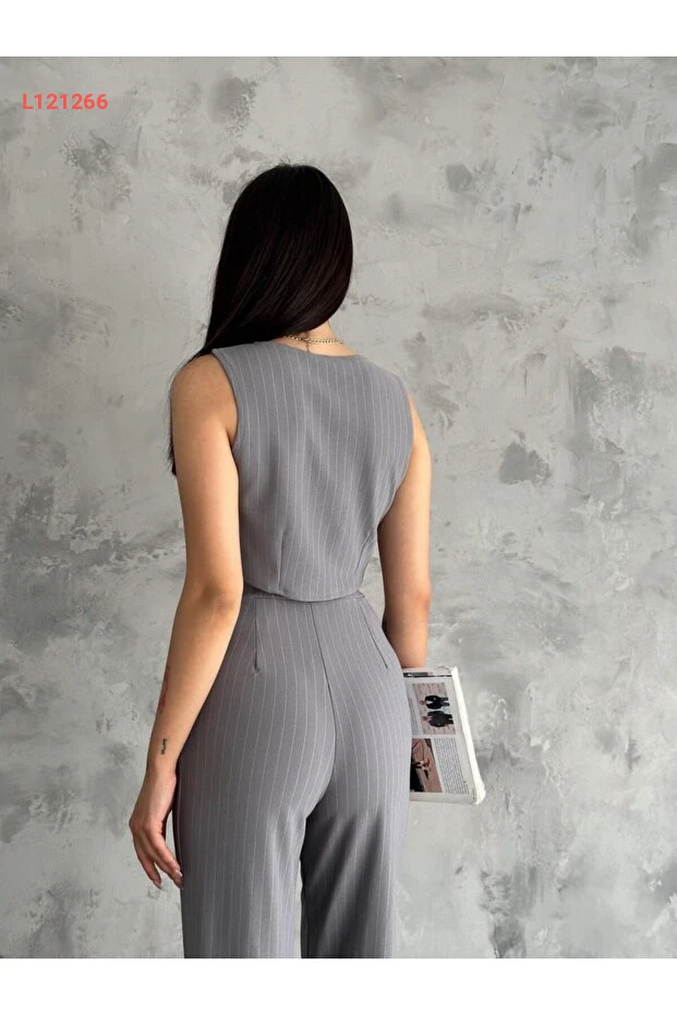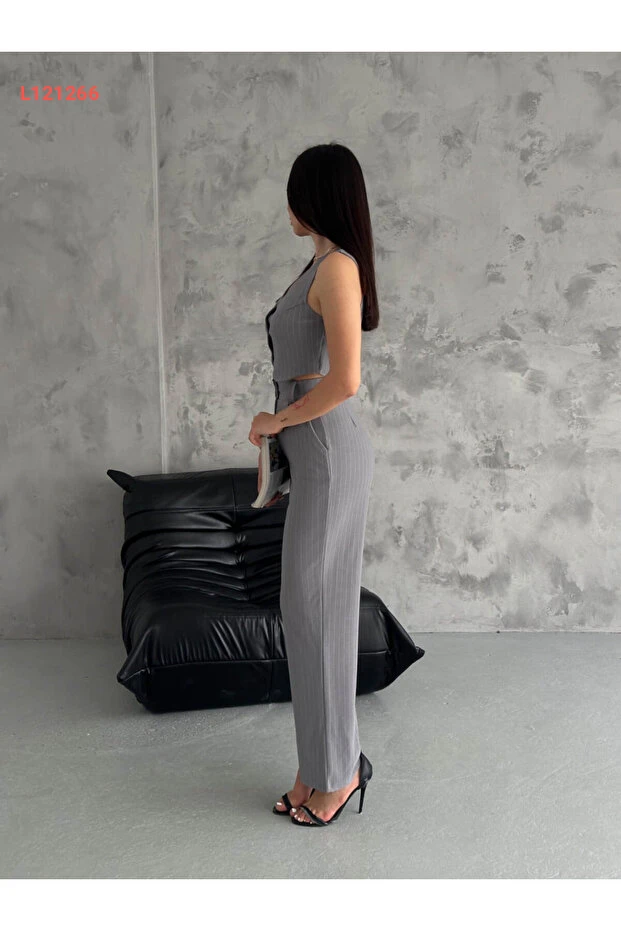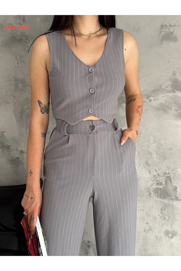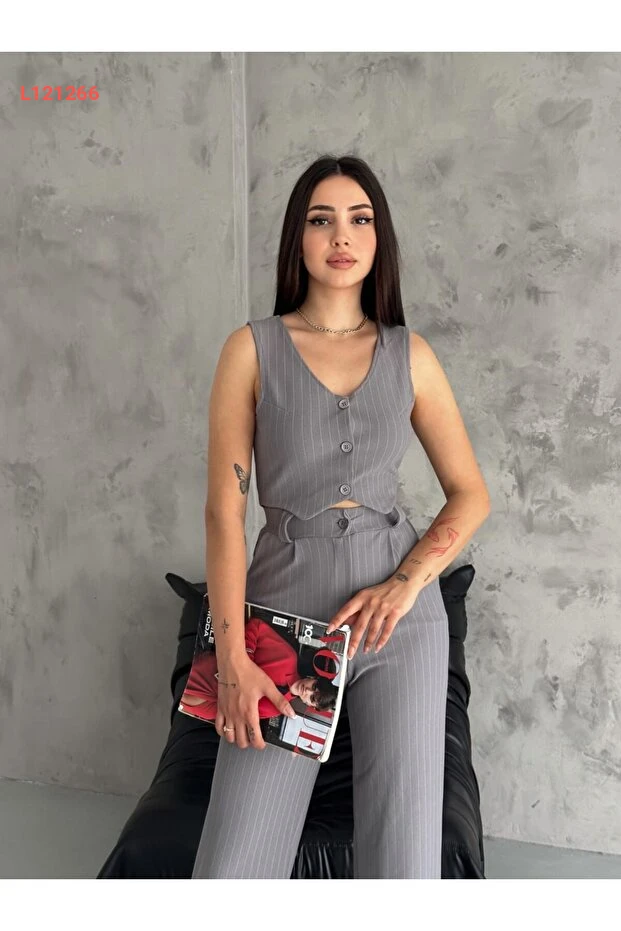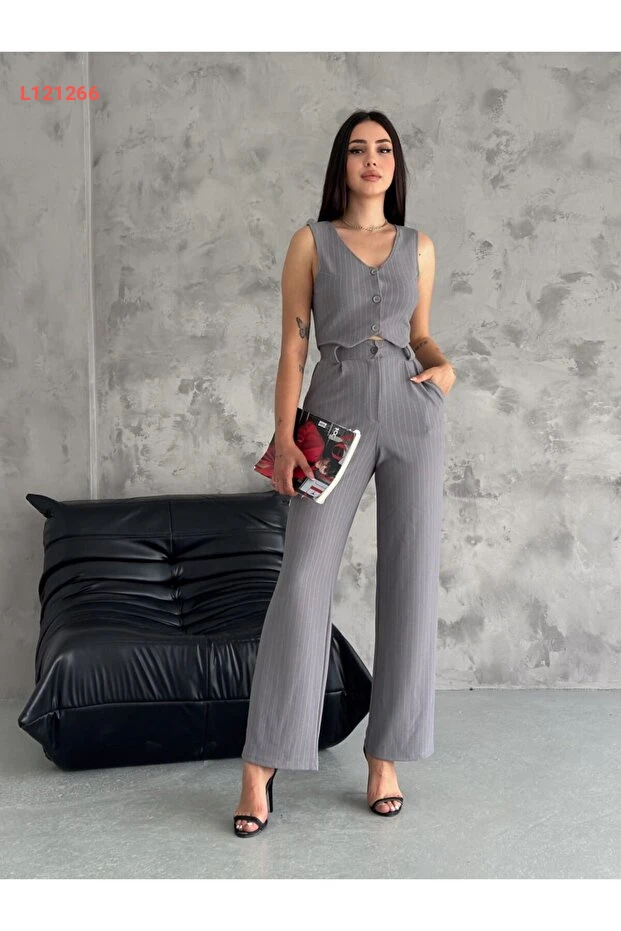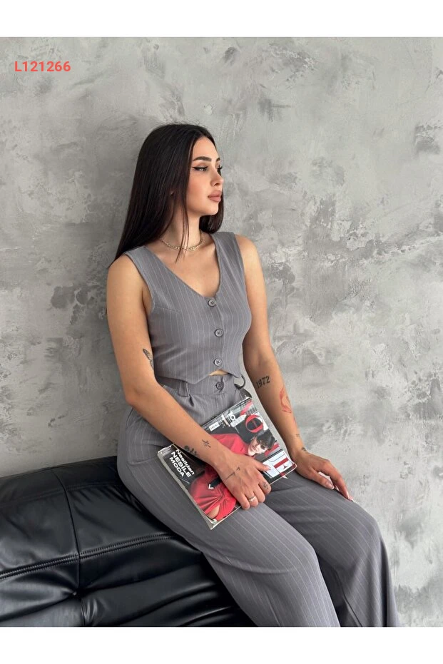 استمتعي بالأناقة والراحة مع طقم Genel Markalar النسائي المكون من بنطلون بالازو رمادي وقميص قصير مزود بأزرار. تتميز هذه الإطلالة العصرية بتصميمها المخطط الأنيق، مما يجعلها مثالية للمناسبات المختلفة. كوني متألقة ومميزة مع هذا الطقم الذي يجمع بين البساطة والجاذبية.