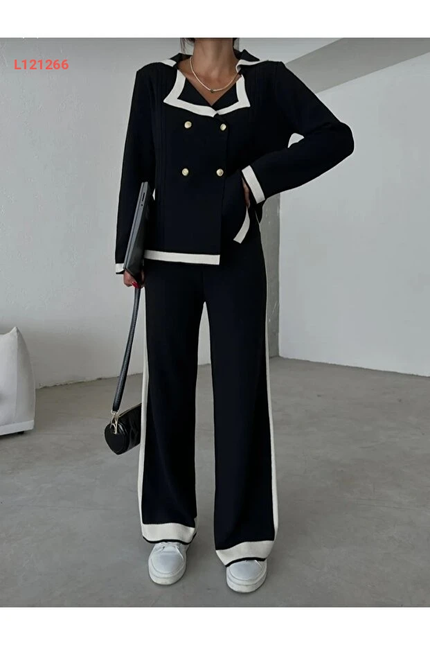 طقم نسائي من الصوف مع سترة بأزرار ذهبية وسروال بالازو بخطوط مميزة