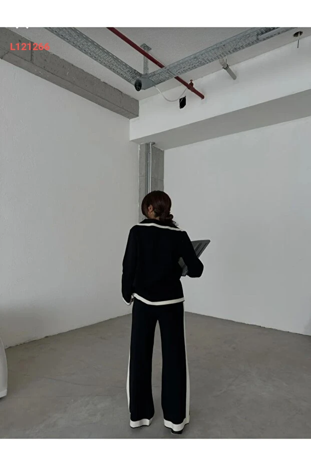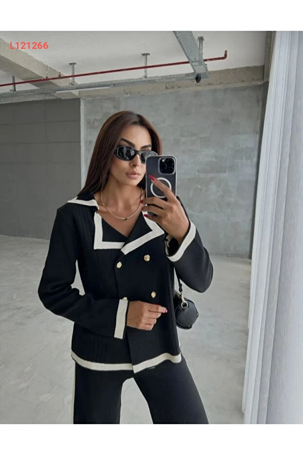 استمتعي بالأناقة والراحة مع طقم التريكو النسائي من جنيل ماركalar، الذي يتضمن سترة بأزرار ذهبية وتفاصيل شريطية جذابة. يضم الطقم بنطلون بالازو الذي يمنحك إطلالة عصرية ومريحة في آن واحد، مما يجعله الخيار المثالي لمناسباتك اليومية. ارتدي هذا التصميم الفريد لتعزيز ثقتك بنفسك وإطلالتك.