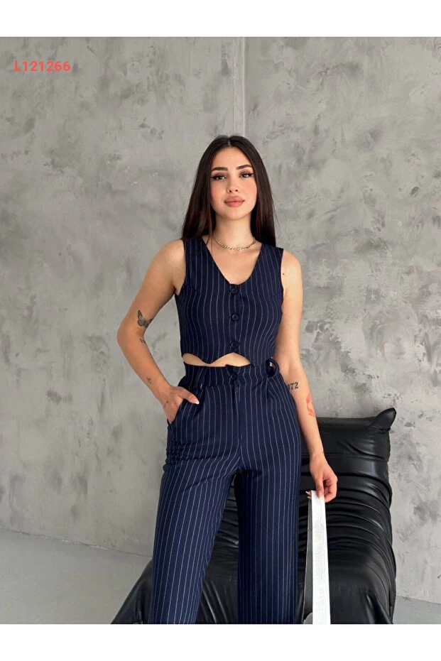 طقم نسائي مكون من بنطال بالازو أزرق داكن مع سترة قميص بطول قصير يزيّنه الأزرار