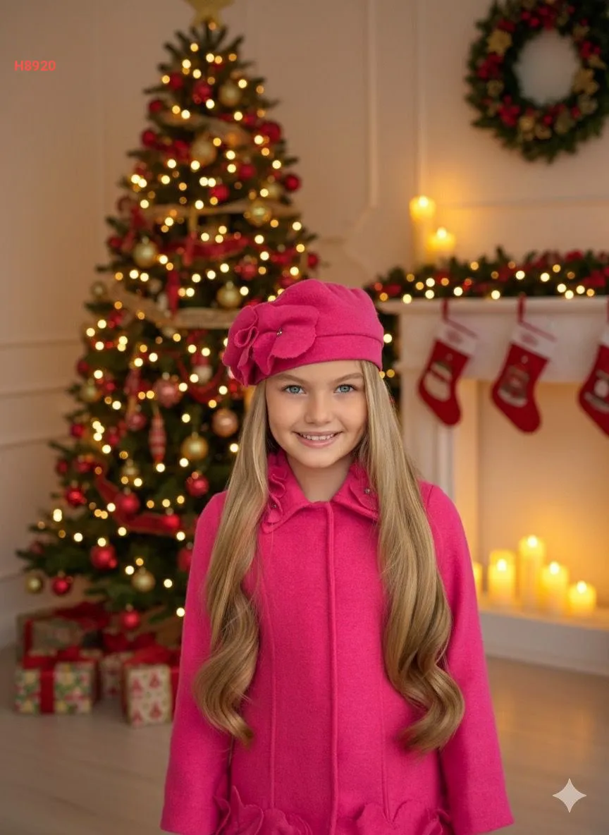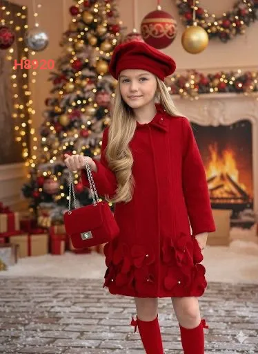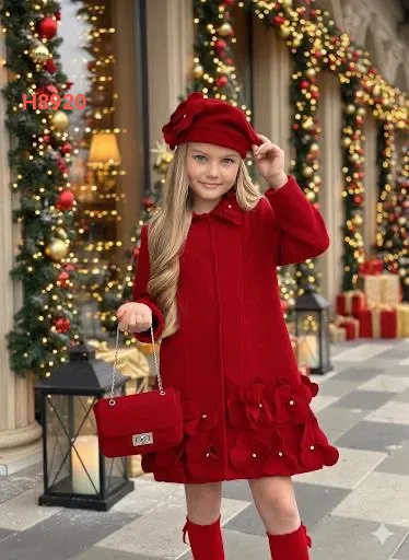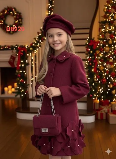 معطف بناتي مزين ورد مع حقيبة وقبعة