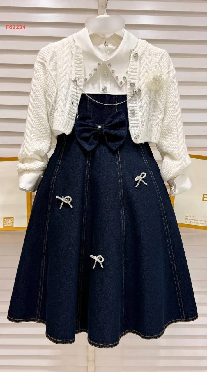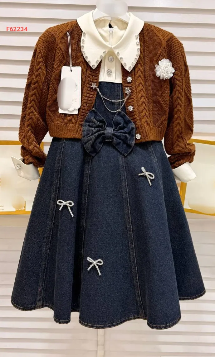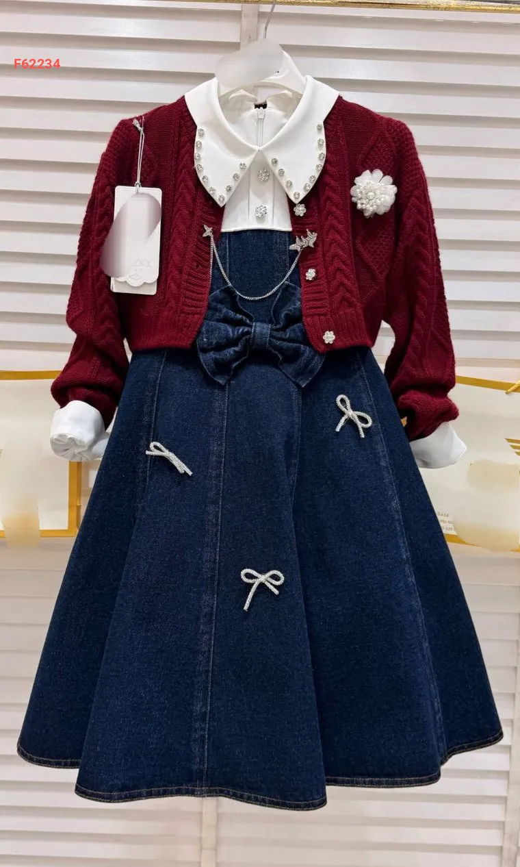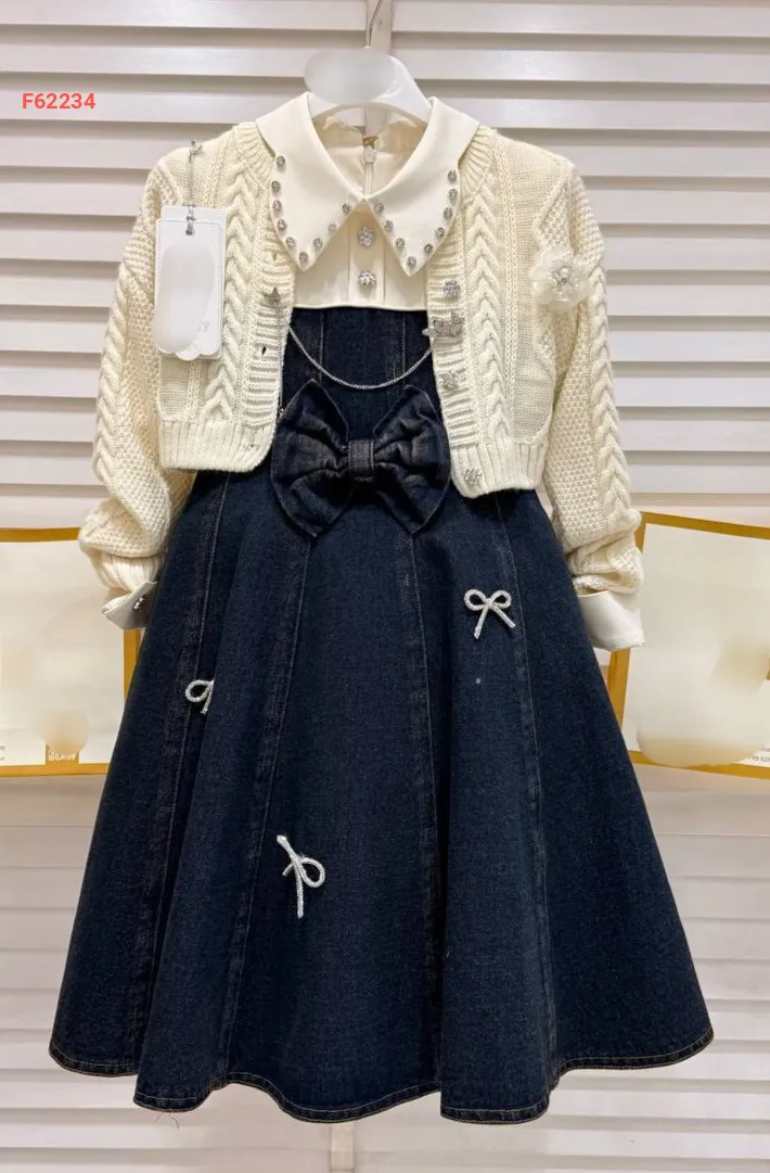 فستان جينز بناتي مع قميص وجاكيت صوف