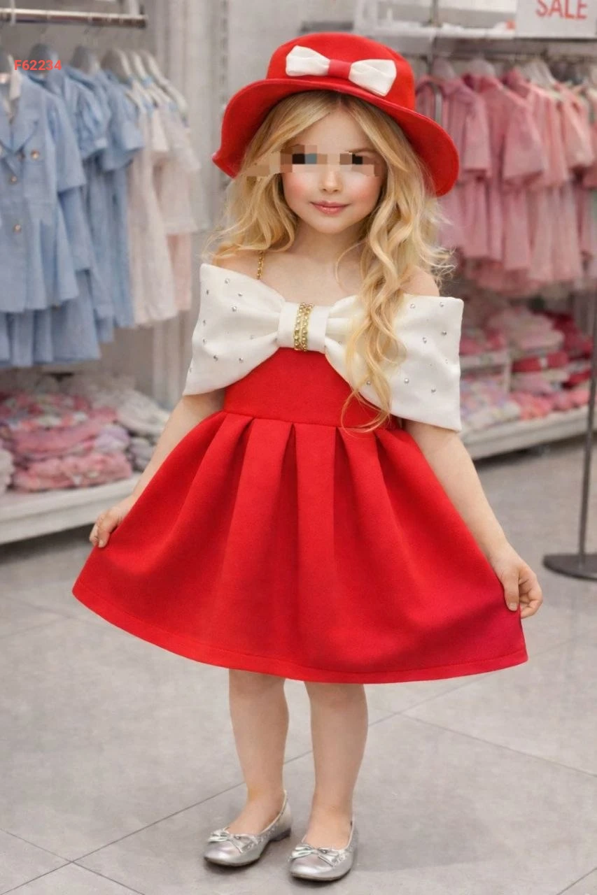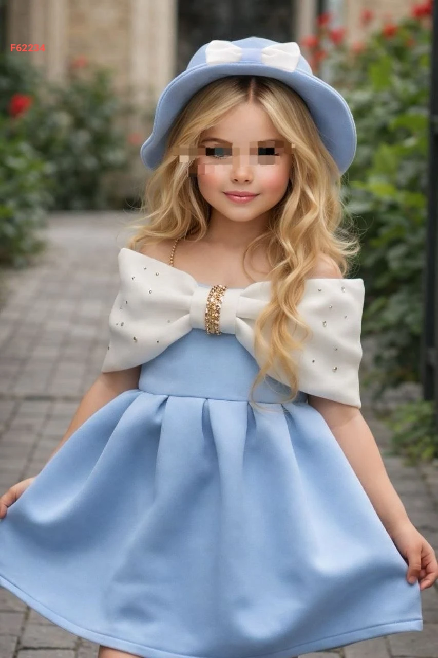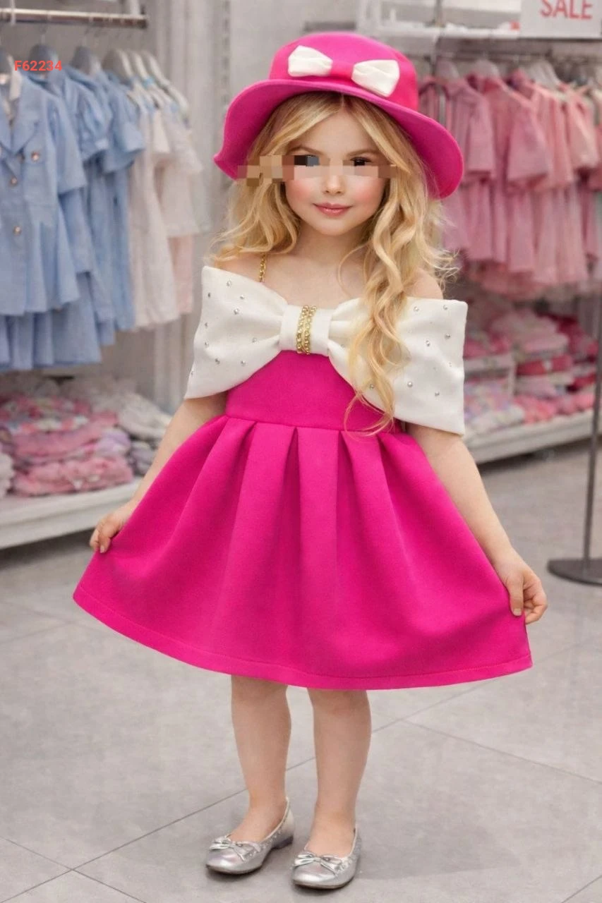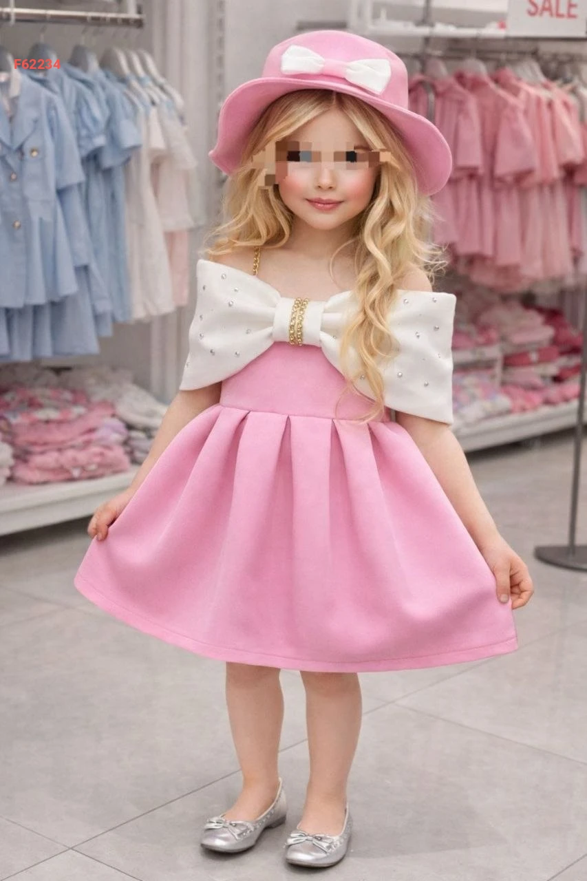 فستان بناتي لونين بتفاصيل فيونك وألماس