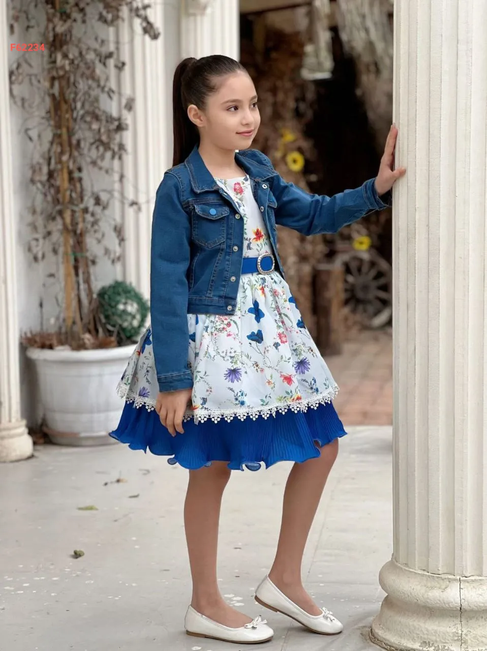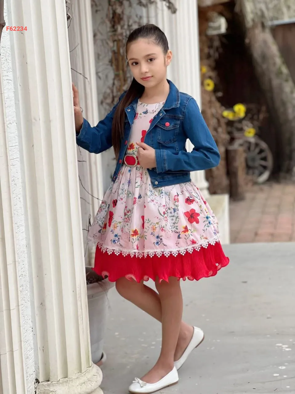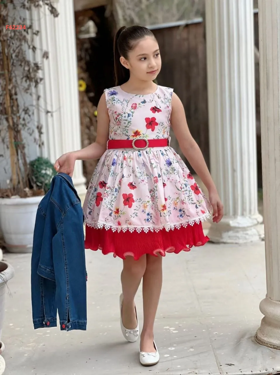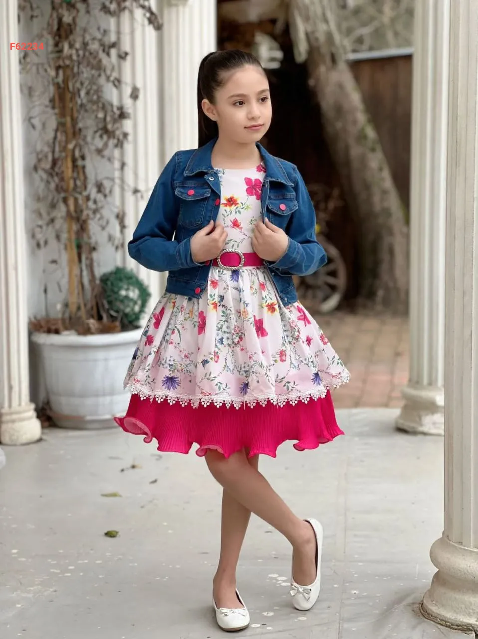فستان بناتي مورد مع جاكيت جينز
