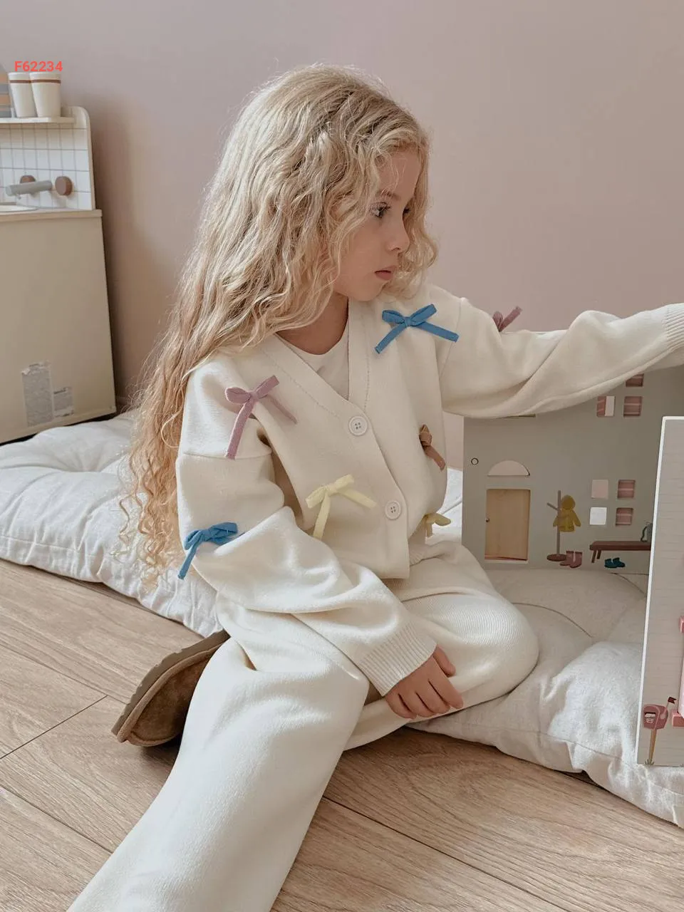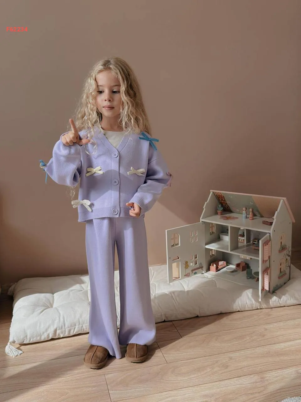 طقم بنطال بناتي تريكو وجاكيت بفيونكات