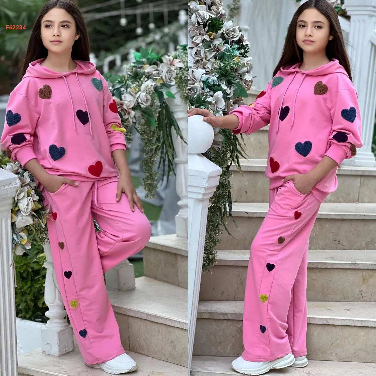 بيجامة بناتي كم طويل مطبعة قلوب