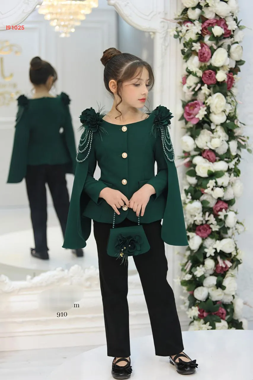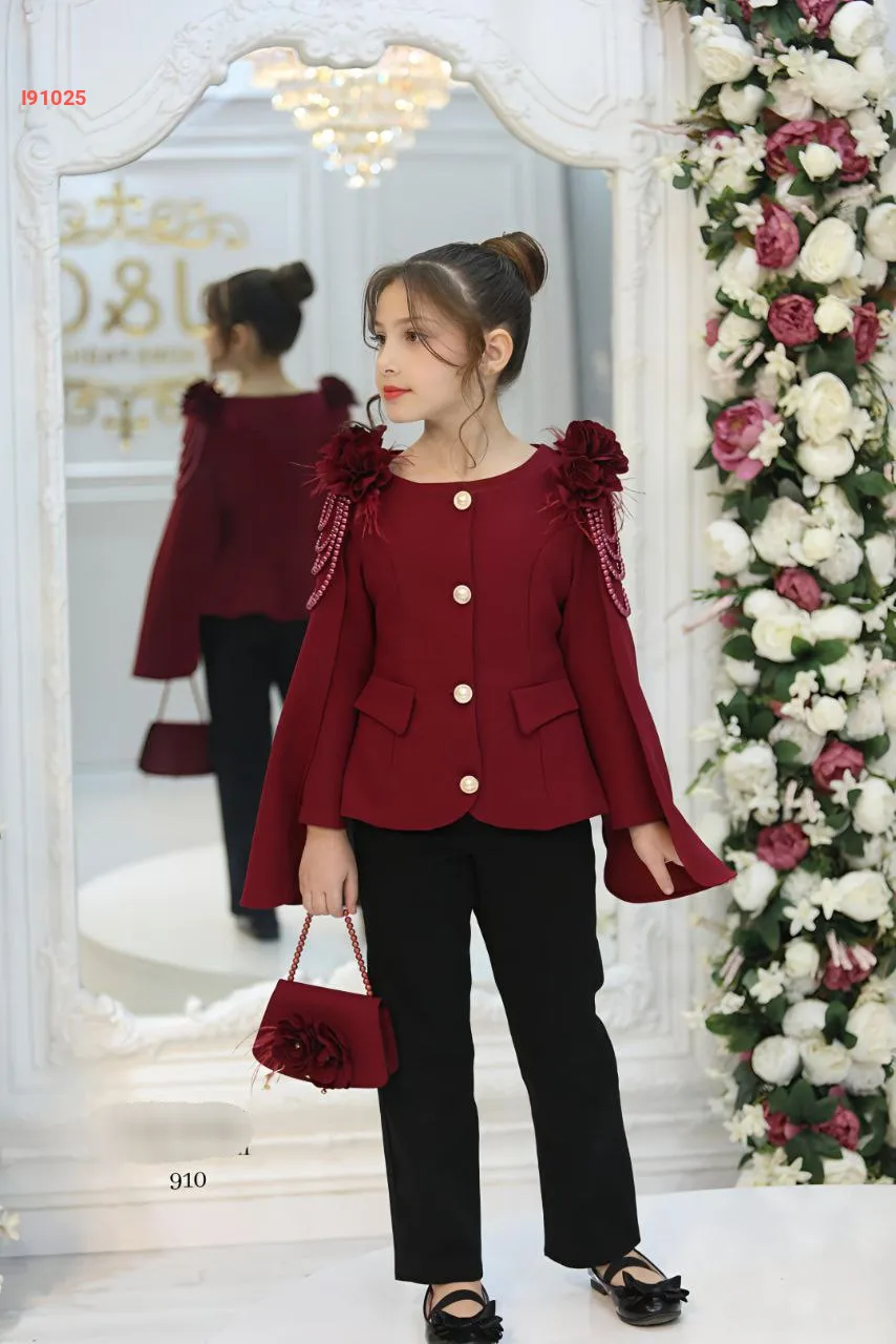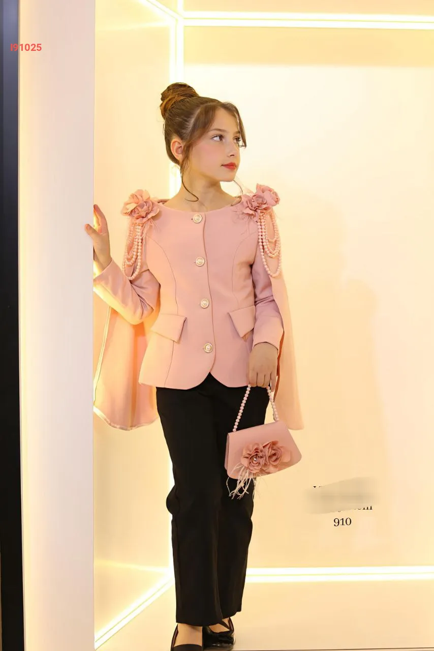 طقم بنطال بناتي وجاكيت مزين ورد ولولو