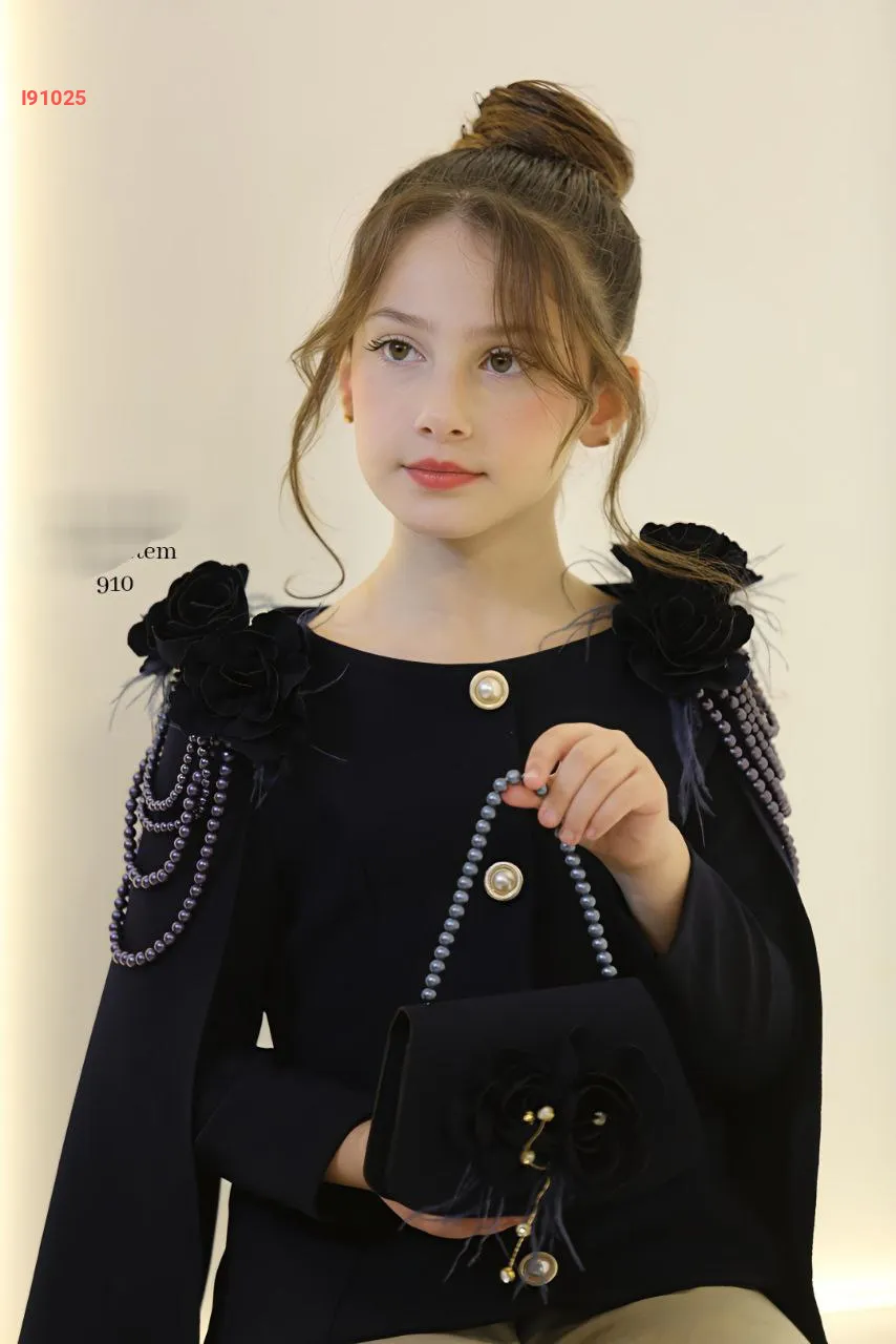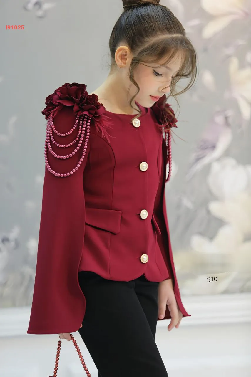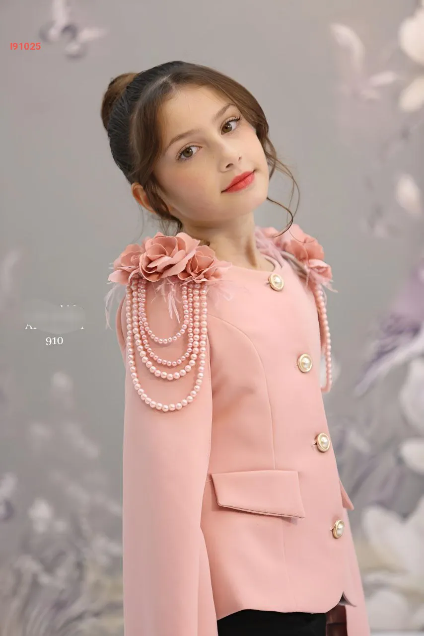 طقم بنطال بناتي وجاكيت مزين ورد ولولو