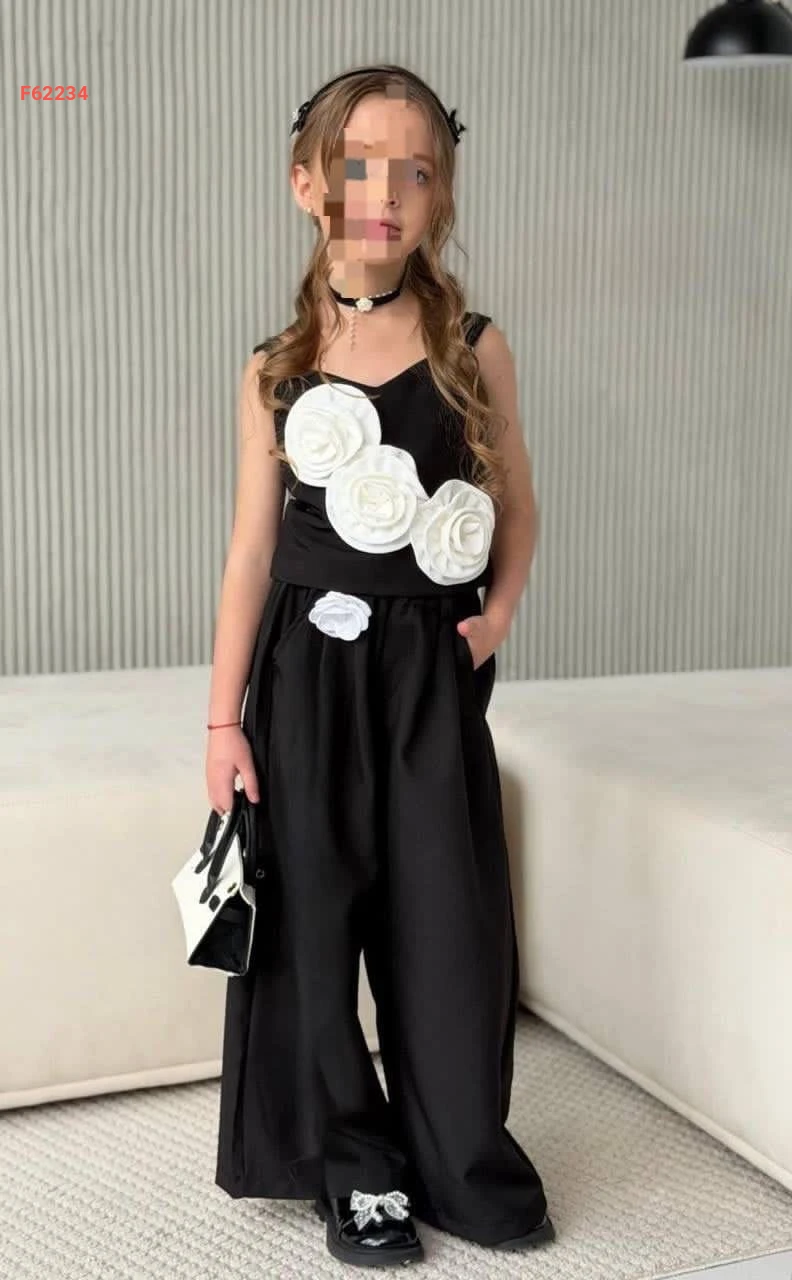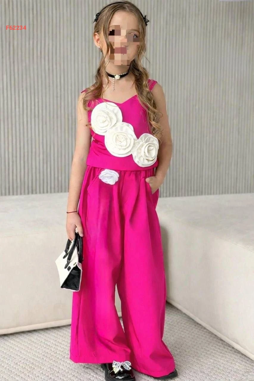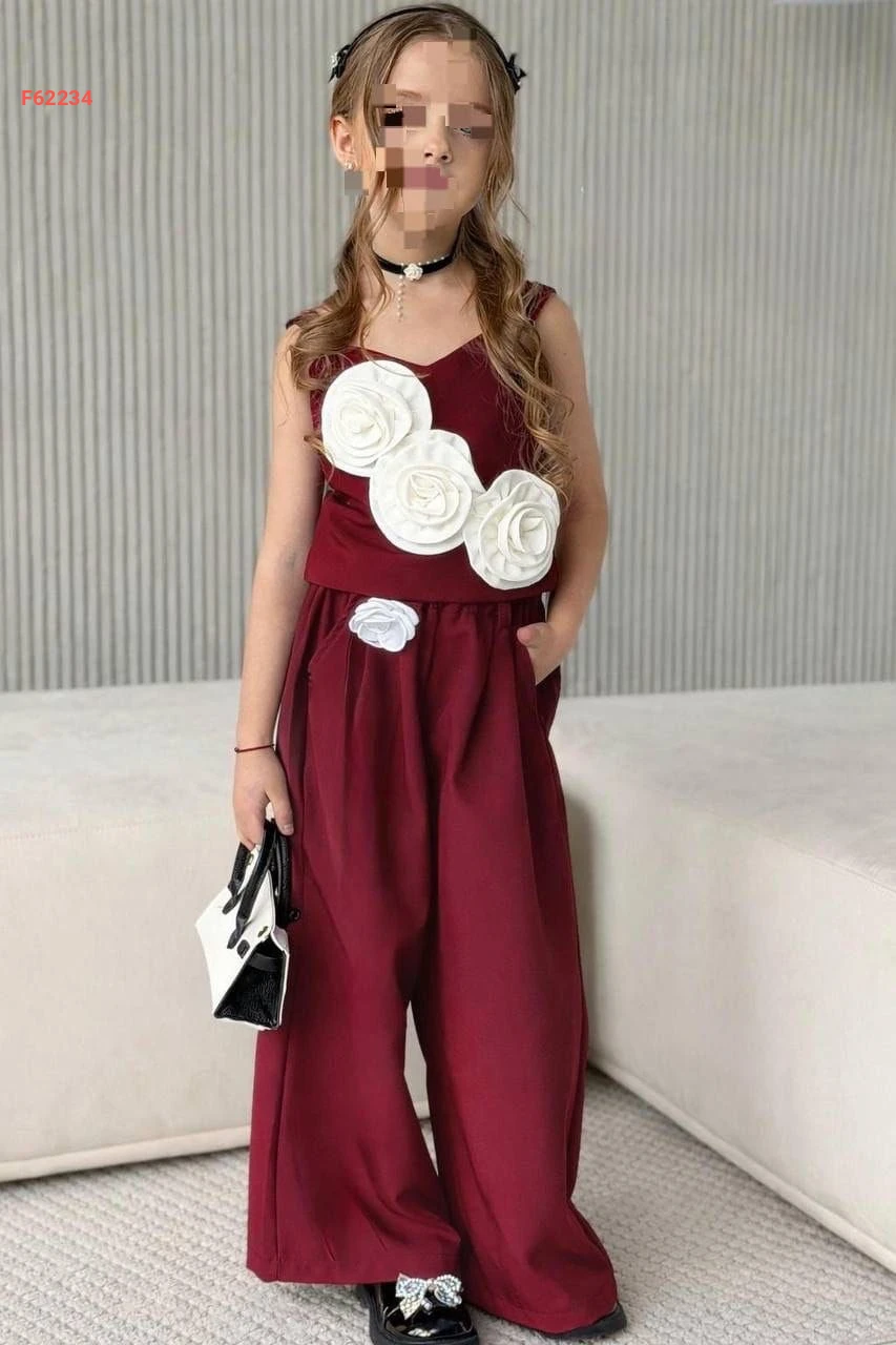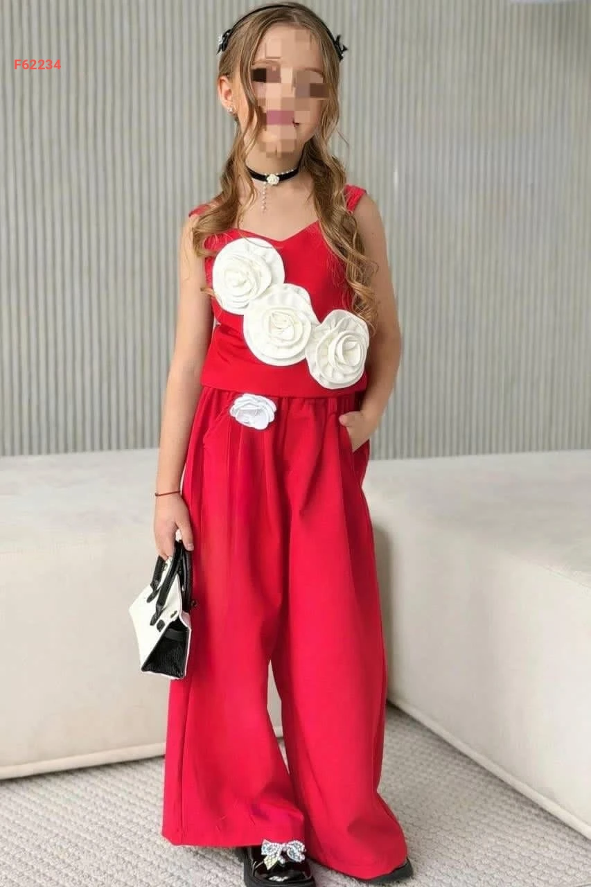طقم بنطال بناتي وبلوزة مزينة ورد