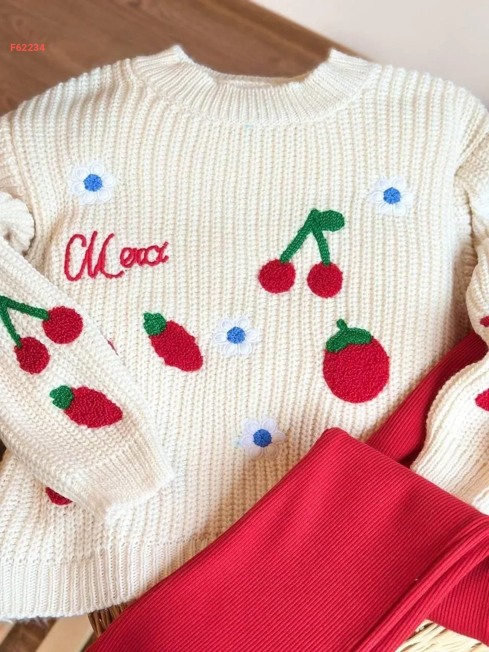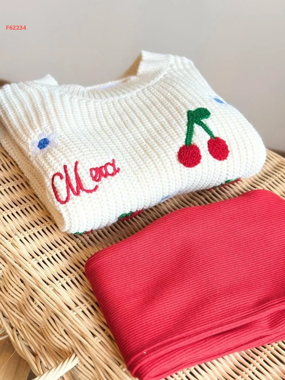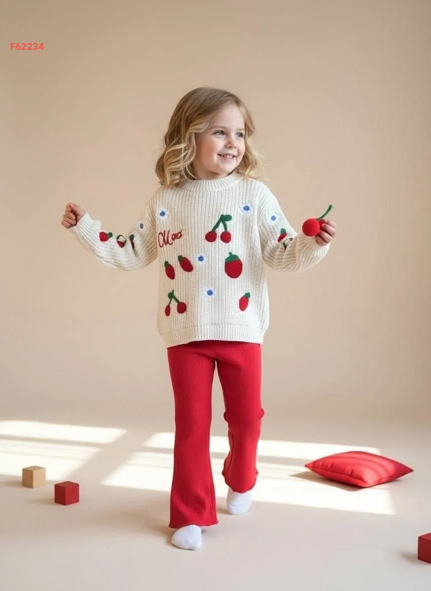 طقم بنطال بناتي وكنزة تريكو مطرزة كرز