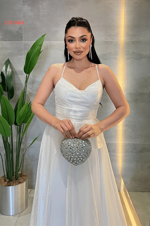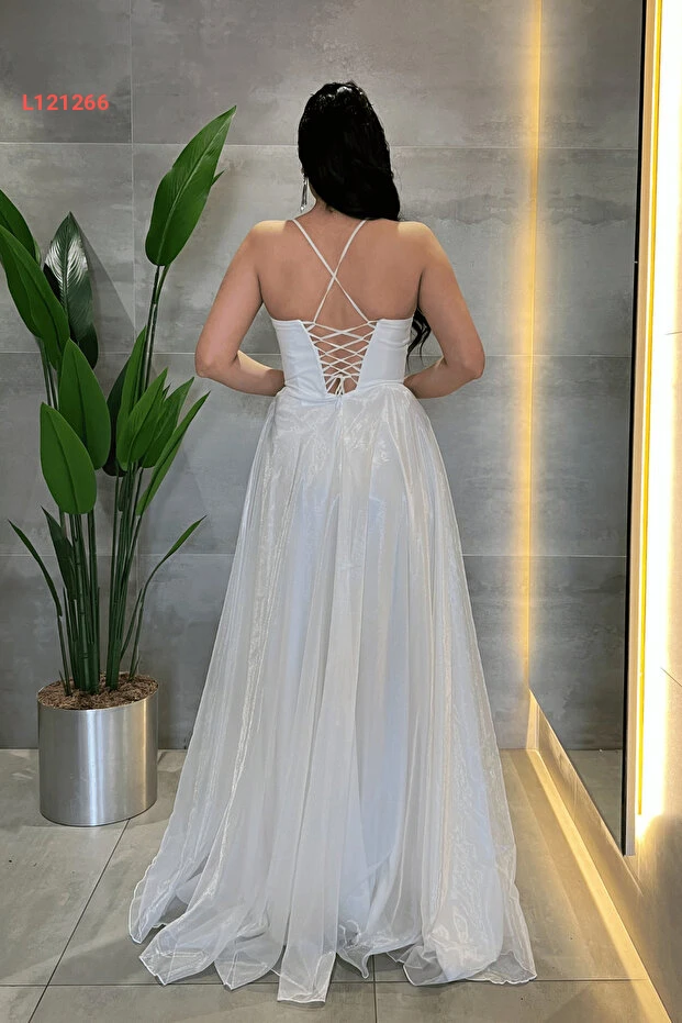 giyimmasalı Organze Şifon Kumaş Sırtı İp Detaylı Abiye Elbise - BEYAZ