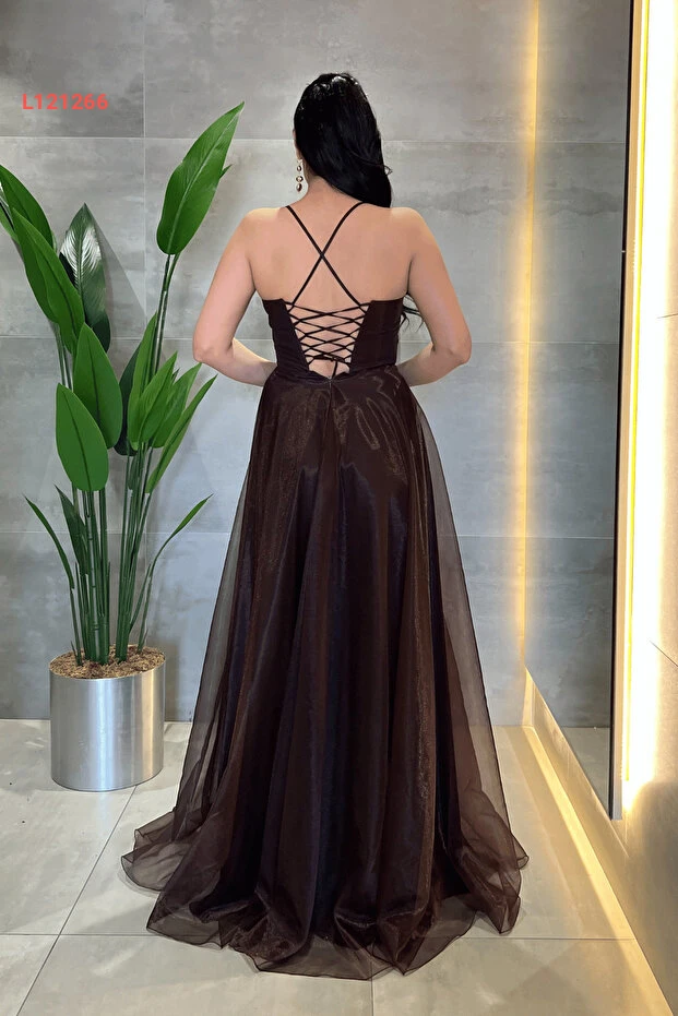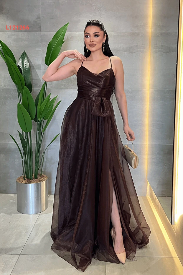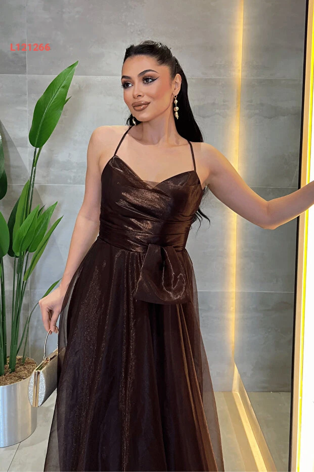 giyimmasalı Organze Şifon Kumaş Sırtı İp Detaylı Abiye Elbise - KAHVERENGİ