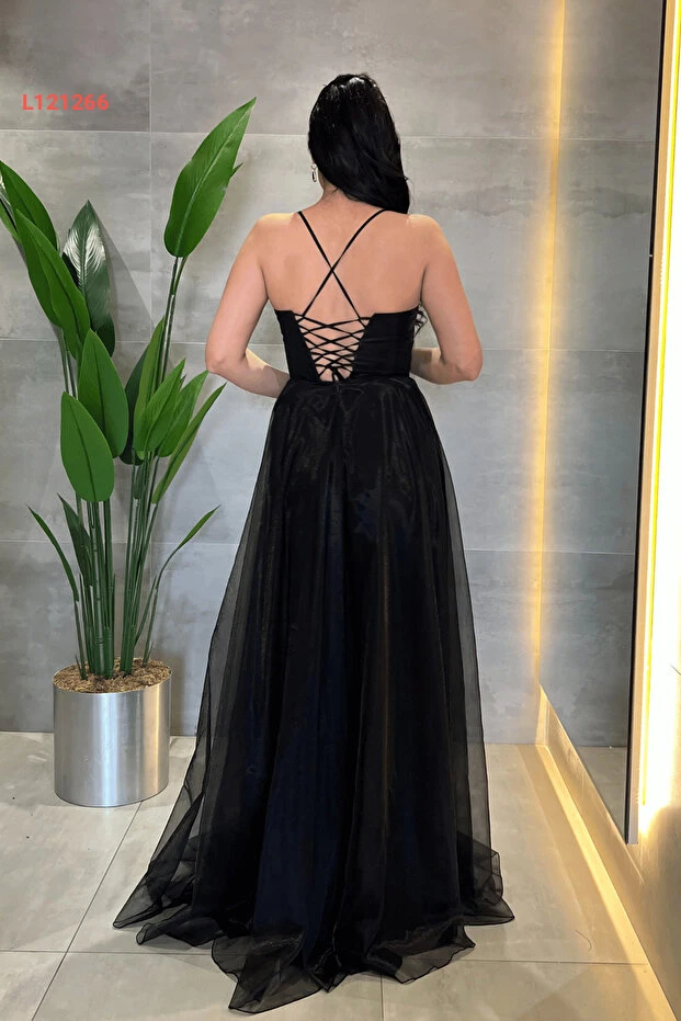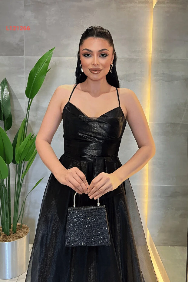 giyimmasalı Organze Şifon Kumaş Sırtı İp Detaylı Abiye Elbise - SİYAH