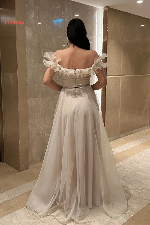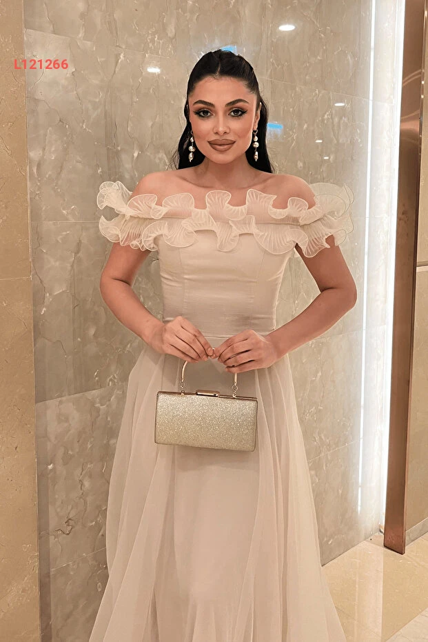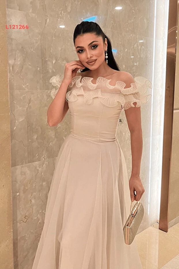 giyimmasalı Organze Şifon Kumaş Volan Detaylı Abiye Elbise - BEJ