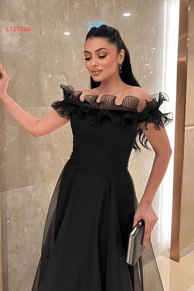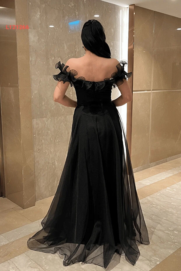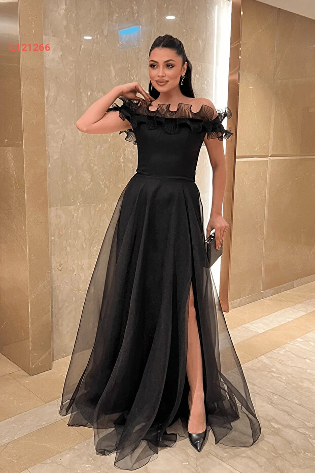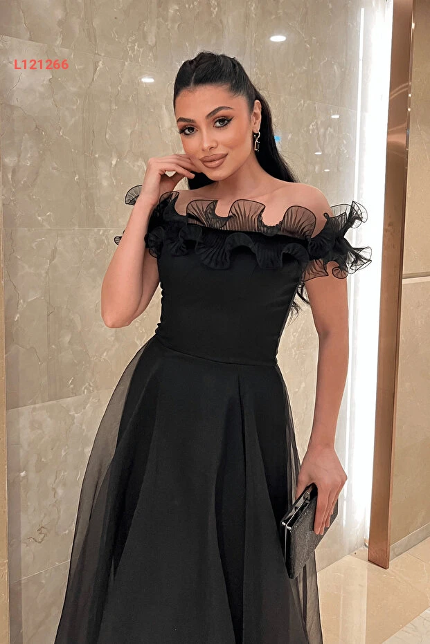 giyimmasalı Organze Şifon Kumaş Volan Detaylı Abiye Elbise - SİYAH