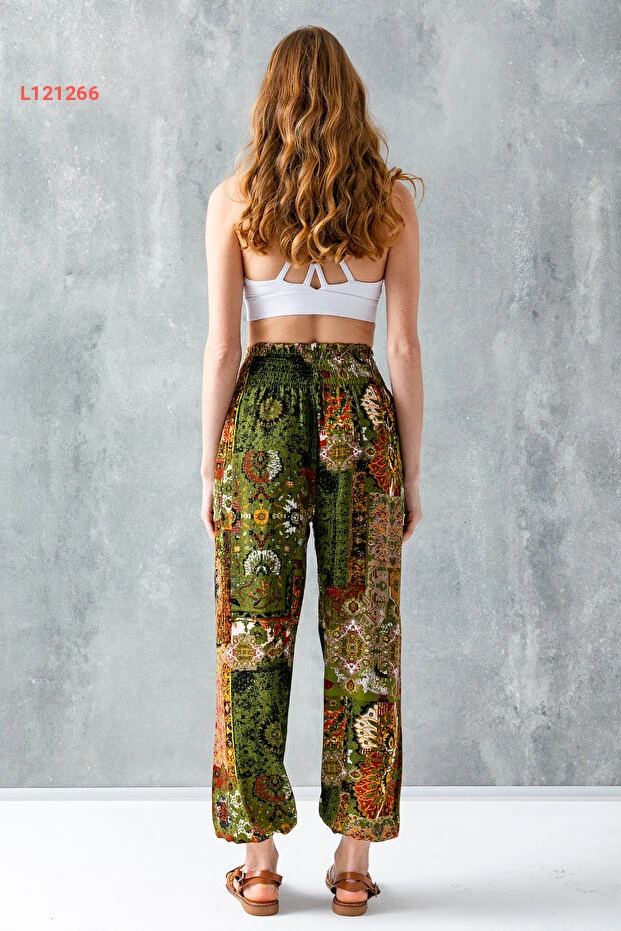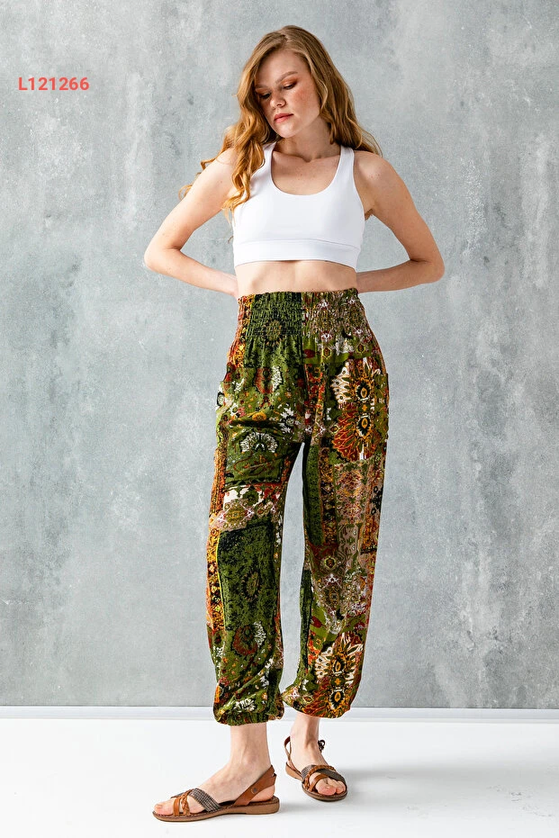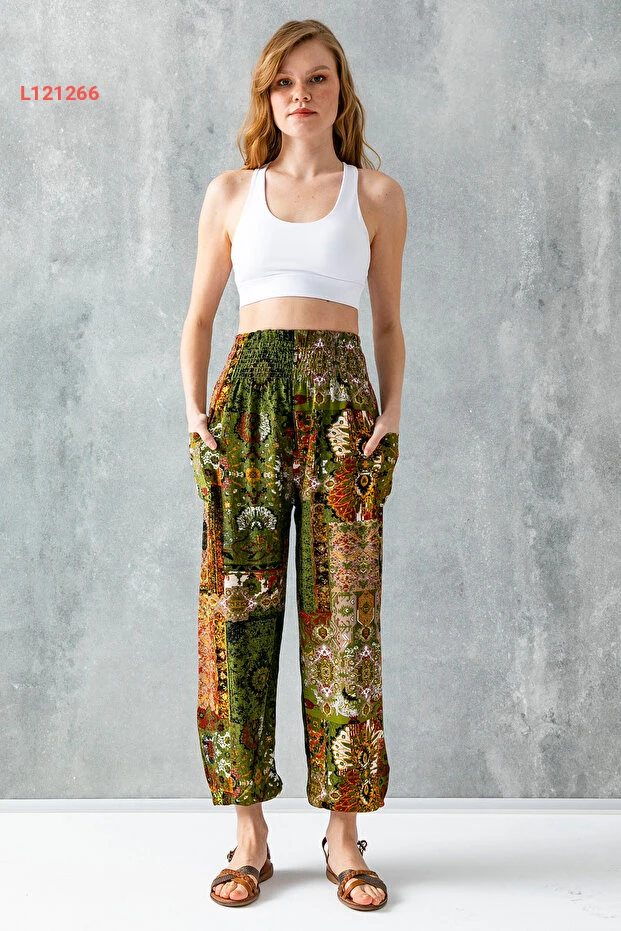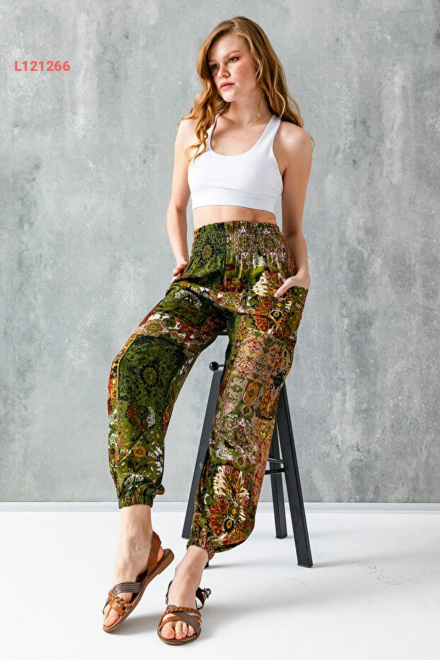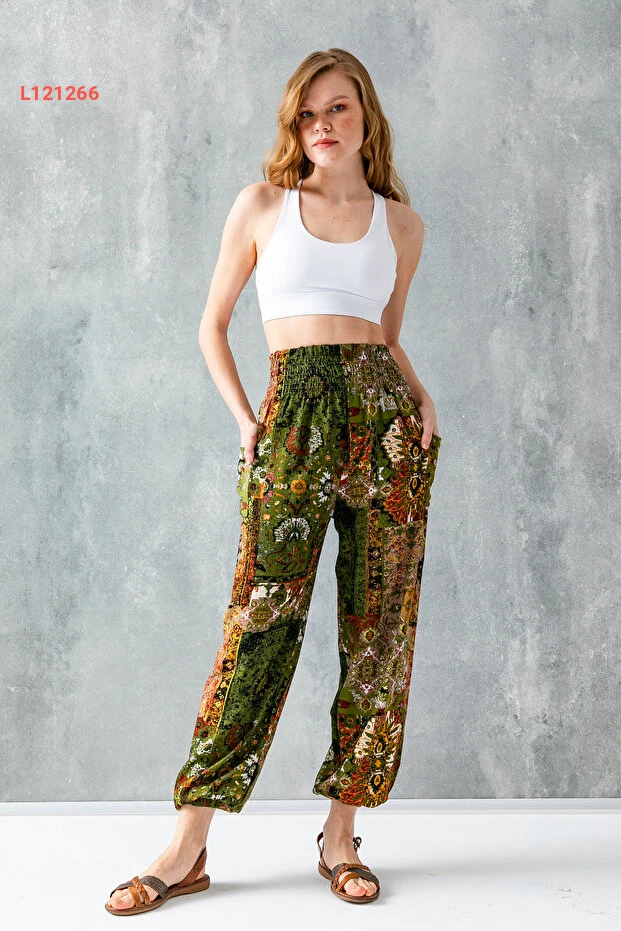 استمتعي بأقصى درجات الراحة والأناقة مع بنطلون اليوغا النسائي GİYSA ذو التصميم الإثني الأخضر. مصنوع من 100% فسكوز، يجمع بين الخامة الناعمة والمرونة المثالية، مما يجعله الخيار المثالي لممارسة الرياضة أو الاسترخاء في المنزل. يتميز بجيوب مزدوجة لسهولة التخزين، لتكوني دائمًا منظمة وأنيقة.