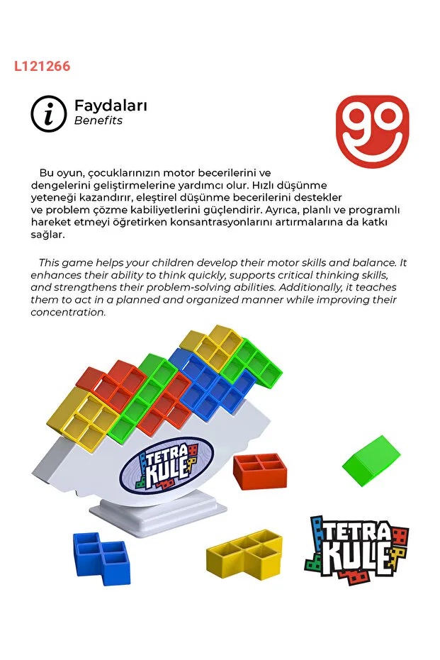 استمتع بتحدي الأذكياء مع لعبة Go Toys Tetra Kule، اللعبة التعليمية التي تجمع بين المرح والتعلم! ستساعدك هذه اللعبة الكلاسيكية المستوحاة من تيتريس على تعزيز مهارات التفكير المنطقي والتركيز، بينما تتناغم الألوان الزاهية والأشكال المتنوعة لتخلق تجربة لعب مثيرة ومشوقة. اجعل أوقات الفراغ مليئة بالإبداع والتسلية مع Tetra Tower!