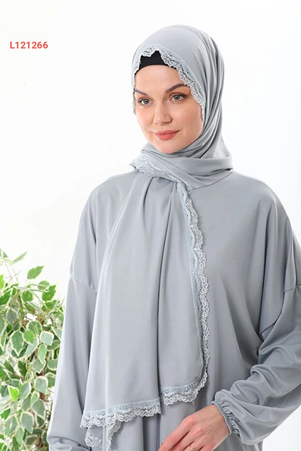 عباءة صلاة رمادية ذات ياقة دانتيل وسحّاب وأساور مطاطية مقاومة للانزلاق